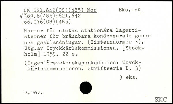 Normer för slutna stationära lagercisterner för brännbara kondenserade gaser och gasblandningar. (Cisternnormer 3), Utg.av Tryckkärlskommissionen.
