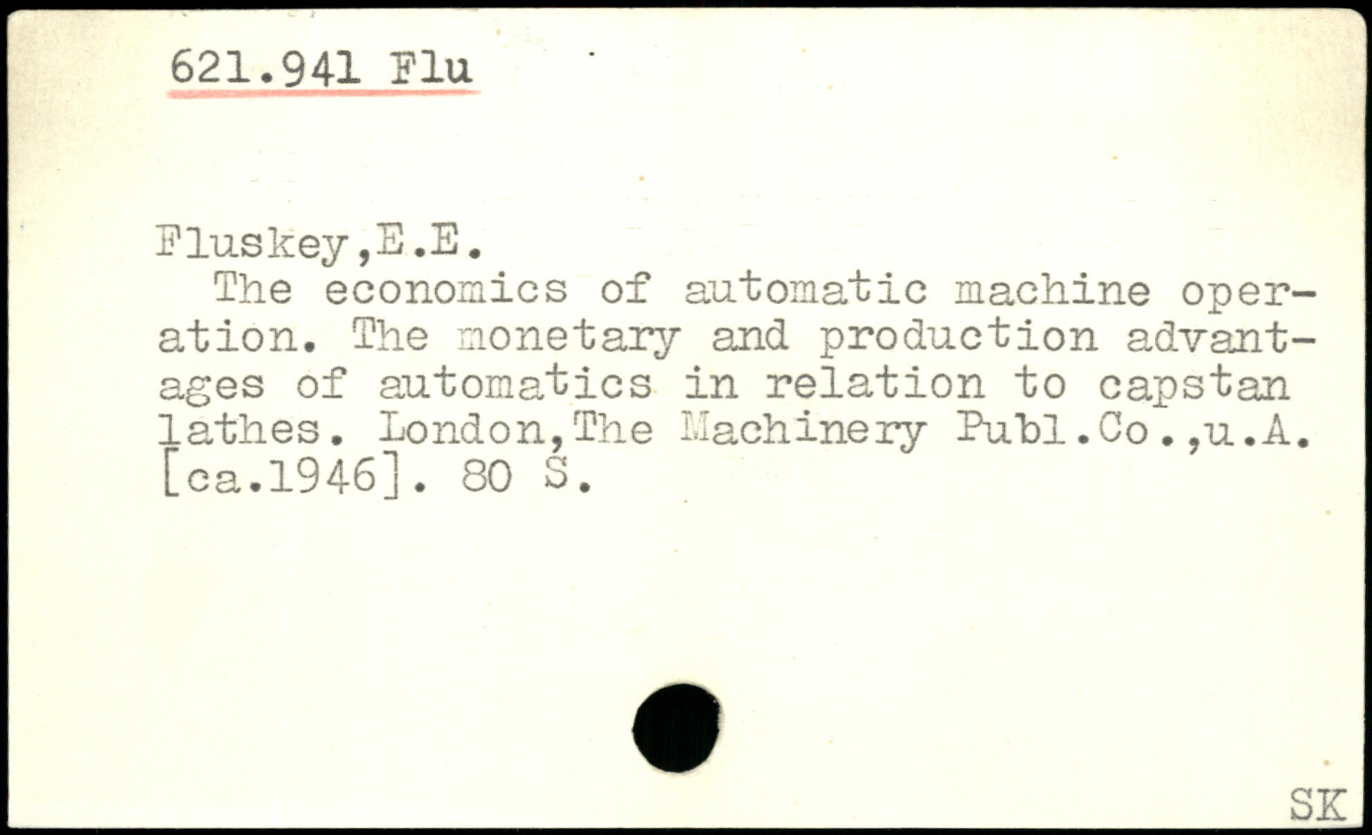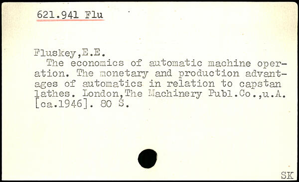 The economics of automatic machine operation. The monetary and production advantages of automatics in relation to capstan lathes. London,The Machinery Publ.Co.,u.A. [ca.1946].