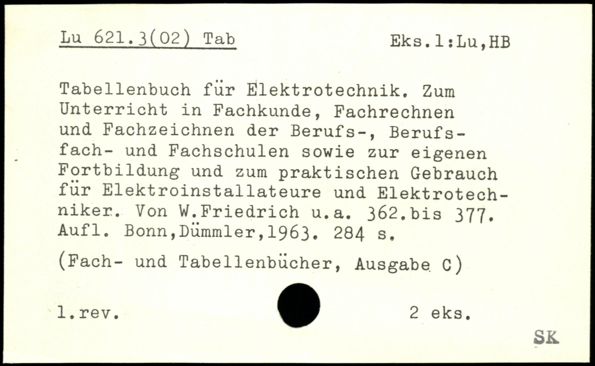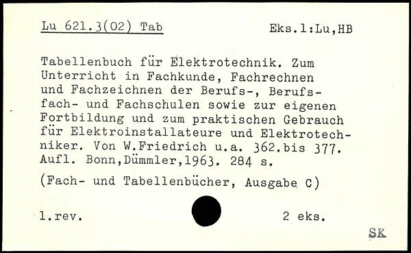 Tabellenbuch für Elektrotechnik. Zum Unterricht in Fachkunde, Fachrechnen und Fachzeichnen der Berufs-, Berufsfach- und Fachschulen sowie zur eigenen Fortbildung und zum praktischen Gebrauch für Elektroinstallateure und Elektrotechniker. Von W.Friedrich u.a. 362.bis