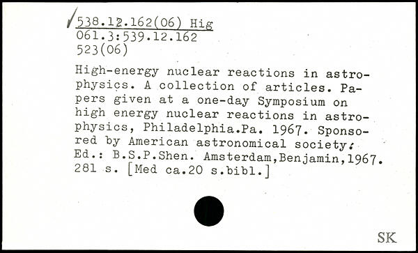 High-energy nuclear reactions in astro-physi<ps. A collection of articles. Papers given at a one-day Symposium on nigh energy nuclear reactions in astrophysics, Philadelphia.Pa. 1967. Sponsored by American astronomical society.' Ed.: B.S.P.Shen.