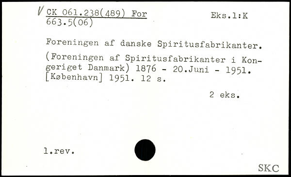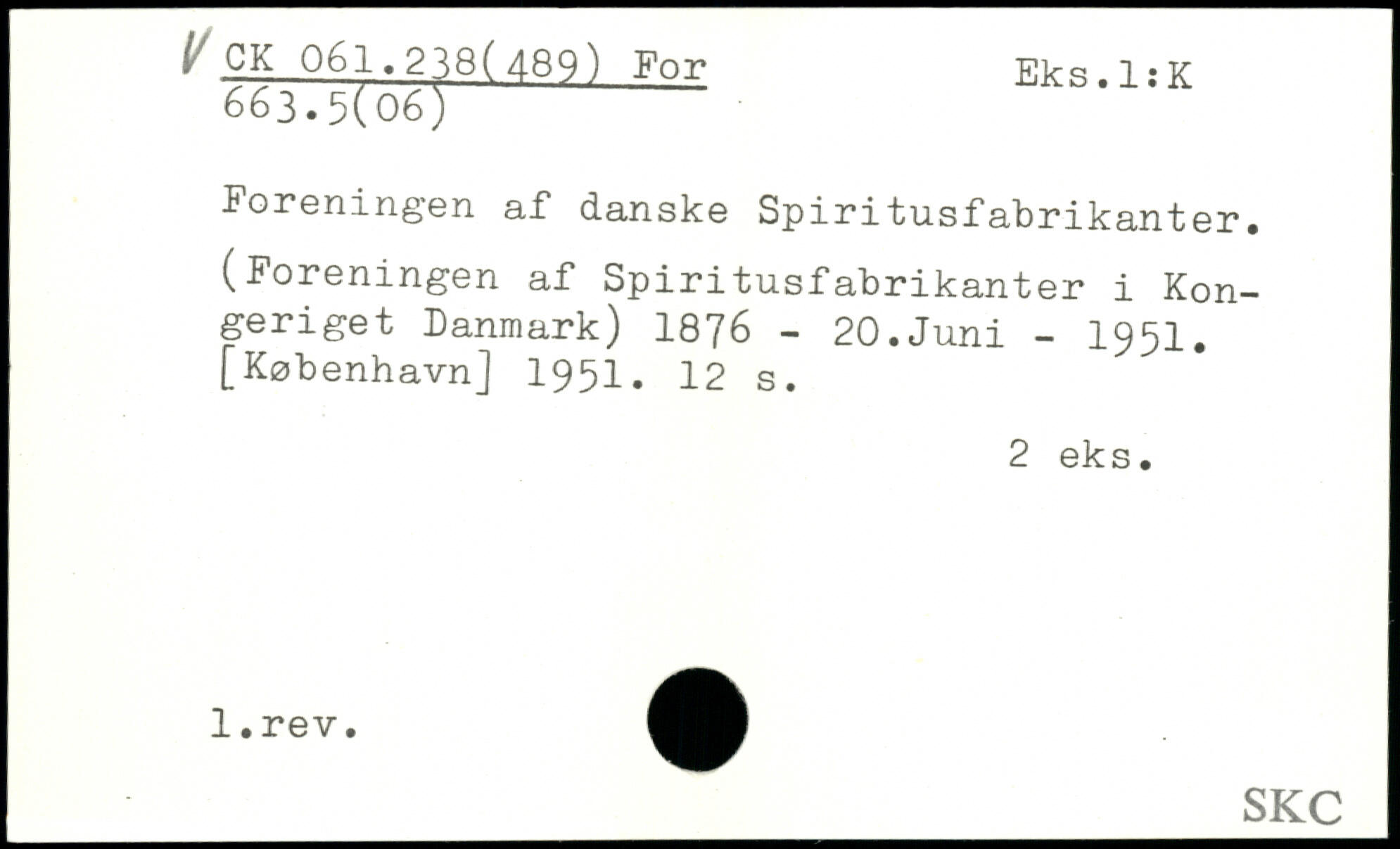 Foreningen af danske Spiritusfabrikanter. (Foreningen af Spiritusfabrikanter i Kongeriget Danmark) 1876 - 20.Juni - 1951.