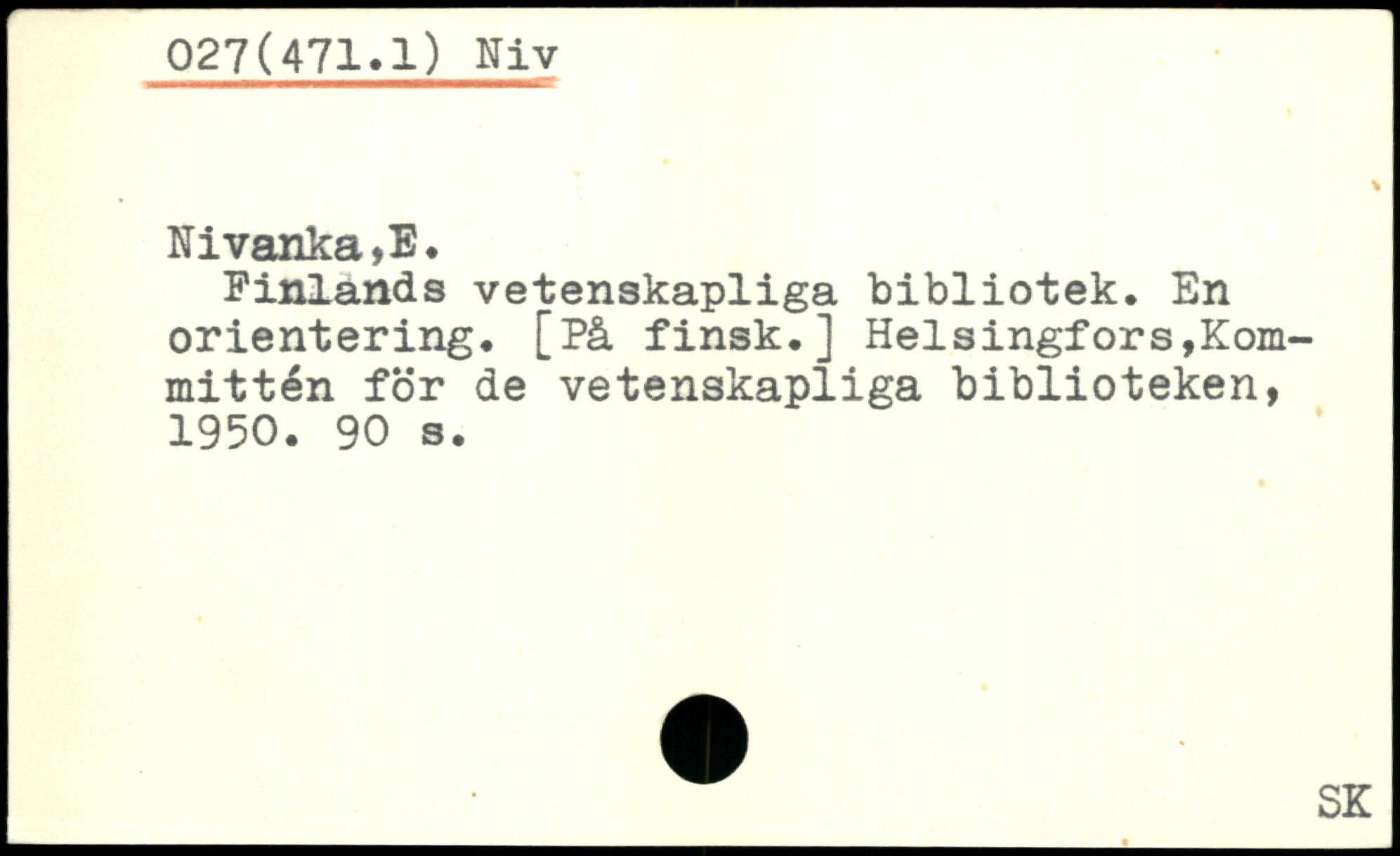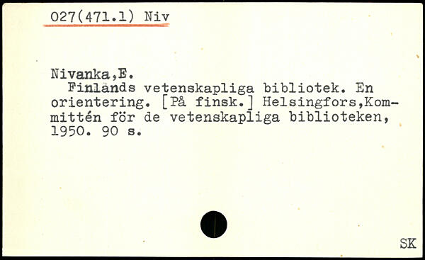 Finlands vetenskapliga bibliotek. En orientering. [På finsk.] Helsingfors,Kommittén för de vetenskapliga biblioteken, 1950.