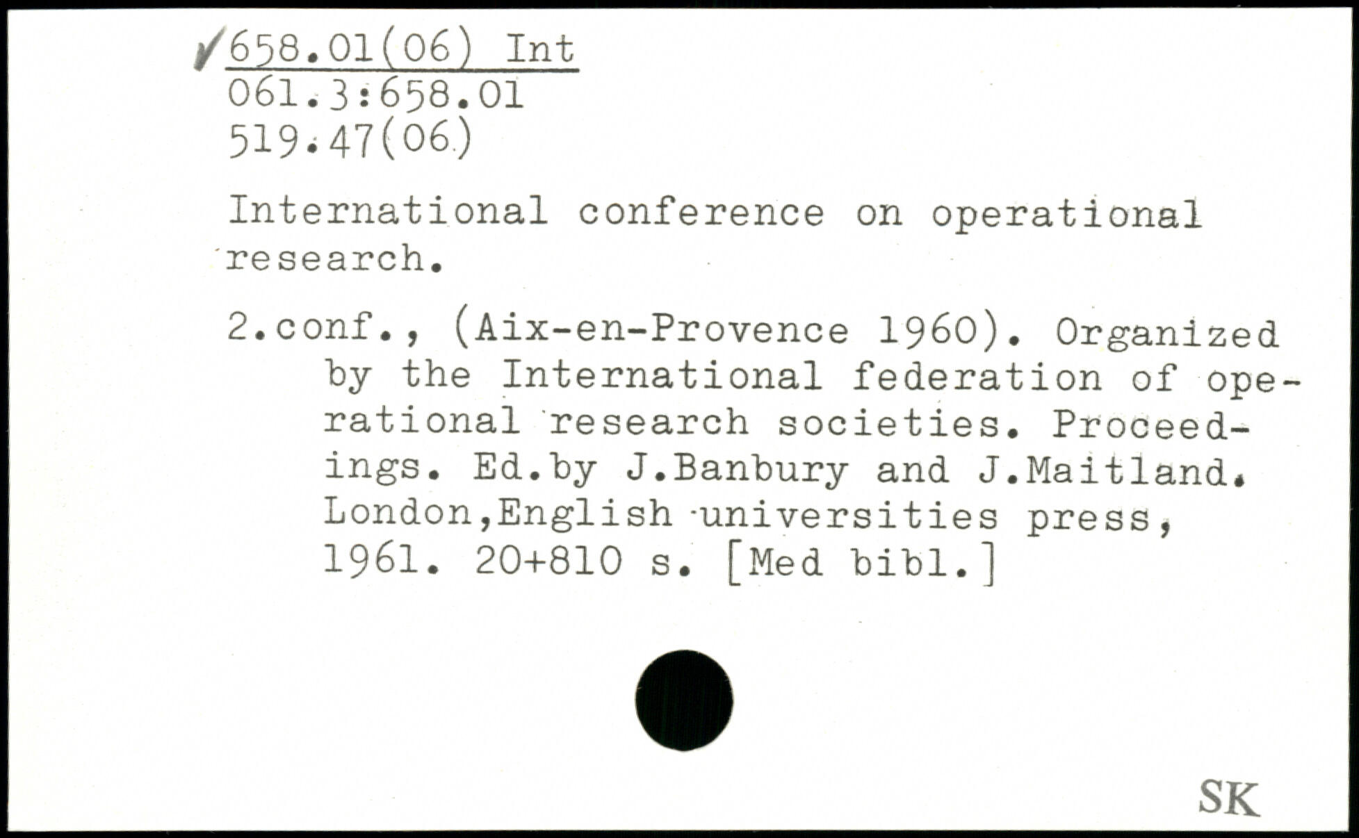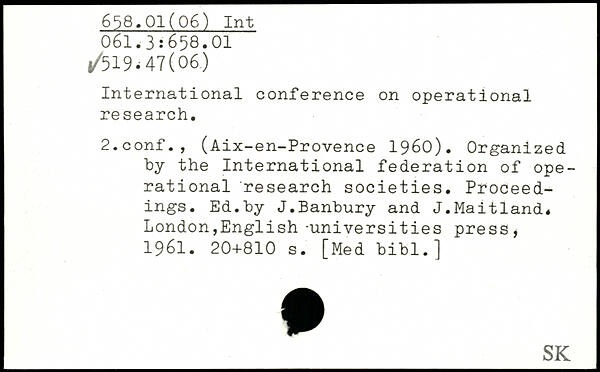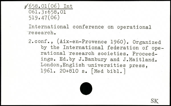 International conference on operational research. 2.conf., (Aix-en-Provence 1960). Organized by the International federation of operational research societies. Proceedings. Ed.by J.Banbury and J.Maitland.