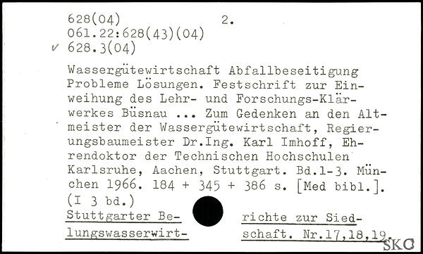 Wassergütewirtschaft Abfallbeseitigung Probleme Lösungen. Festschrift zur Einweihung des Lehr- und Forschungs-Klärwerkes Büsnau ... Zum Gedenken an den Altmeister der Wassergütewirtschaft, Regierungsbaumeister Dr.Ing. Karl Imhoff, Ehrendoktor der Technischen Hochschulen Karlsruhe, Aachen, Stuttgart.