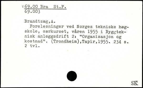 Forelesninger ved Norges tekniske høgskole, særkurset, våren 1955 i Byggtek-nisk anleggsdrift 2: "Organisasjon og kostnad". (Trondheim) ,Tapir, 1955.
