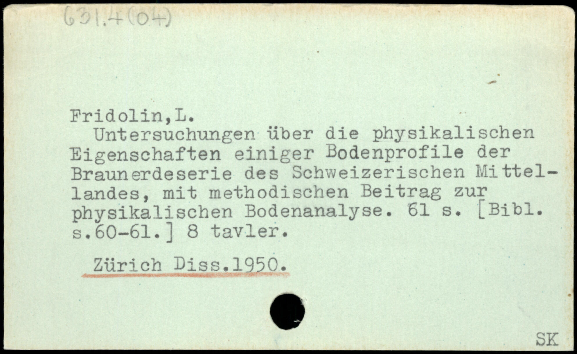 Fridolin,L. Untersuchungen über die physikalischen Eigenschaften einiger Bodenprofile der BraunerdeSerie des Schweizerischen Mittellandes, mit methodischen Beitrag zur physikalischen Bodenanalyse.