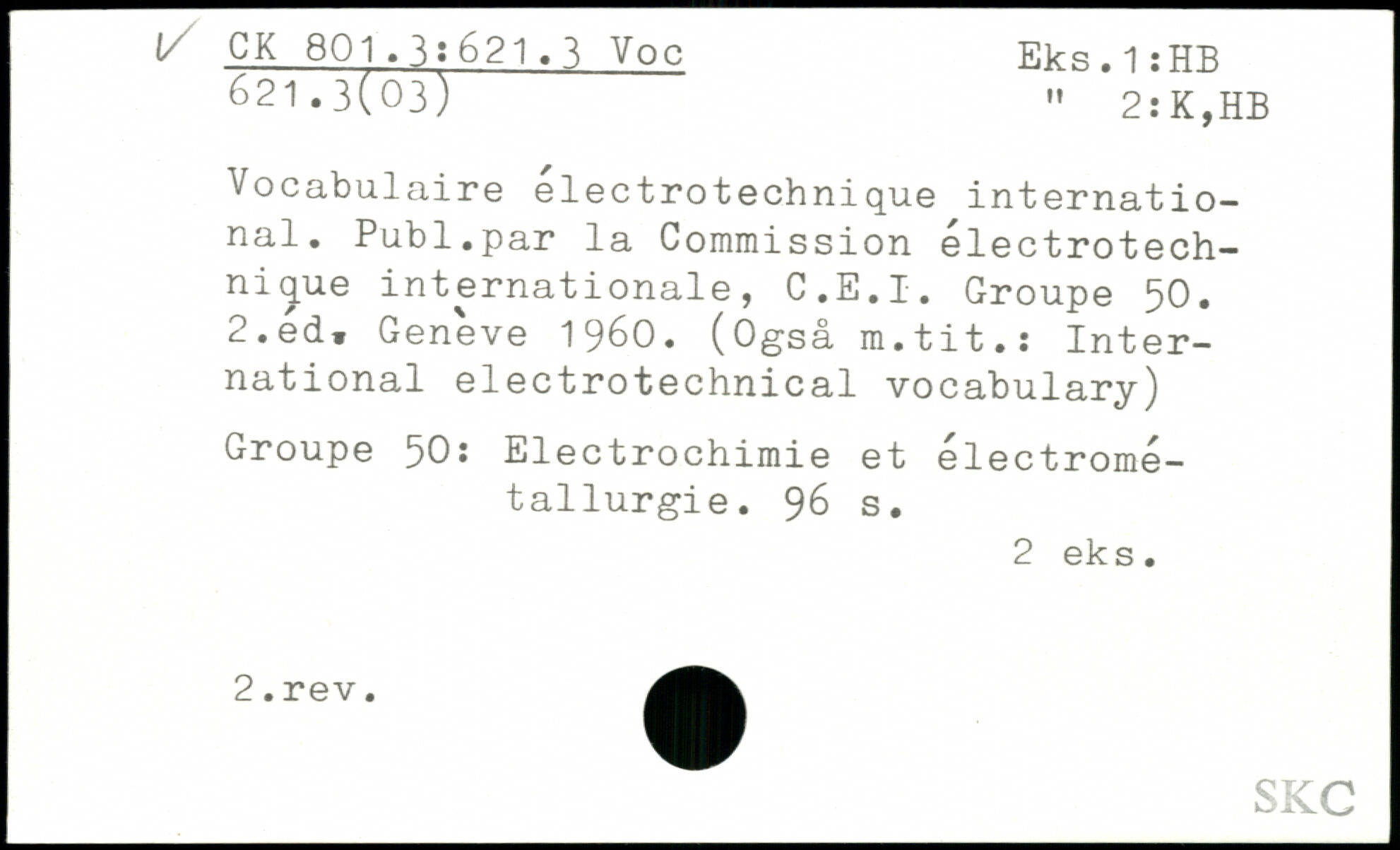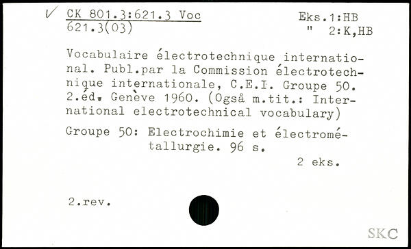 Vocabulaire electrotechnique international. Publ.par la Commission electrotech-nique internationale, C.E.I. Groupe 50. 2.éd, Geneve 1960. (Ogsâ m.tit.: International electrotechnical vocabulary) Groupe 50: Electrochimie et électrométallurgie.