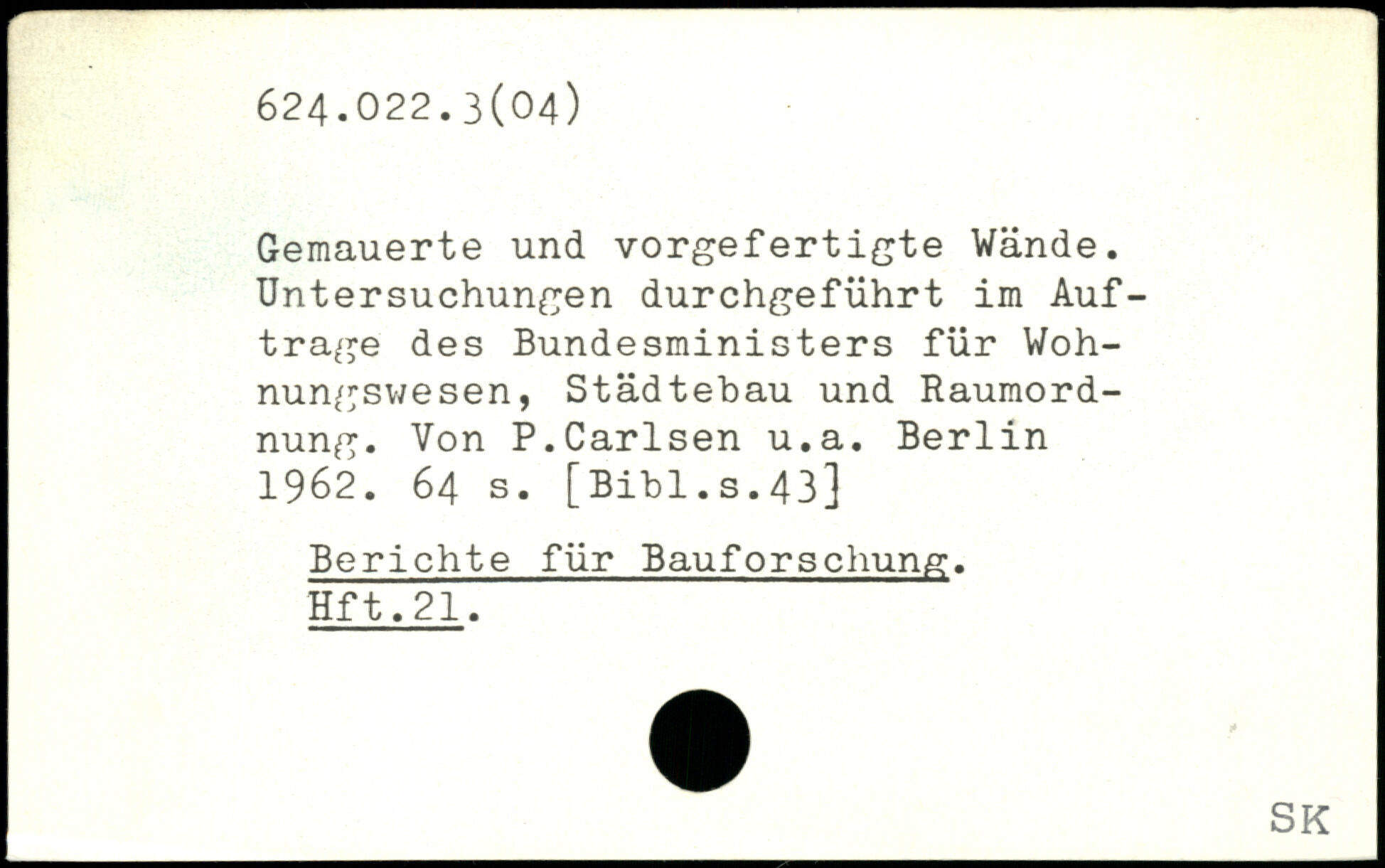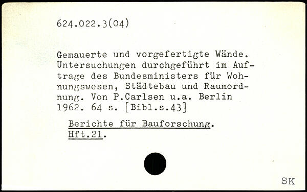 Gemauerte und vorgefertigte Wände. Untersuchungen durchgeführt im Aufträge des Bundesministers für Wohnungswesen, Städtebau und Raumordnung. Von P.Carlsen u.a.