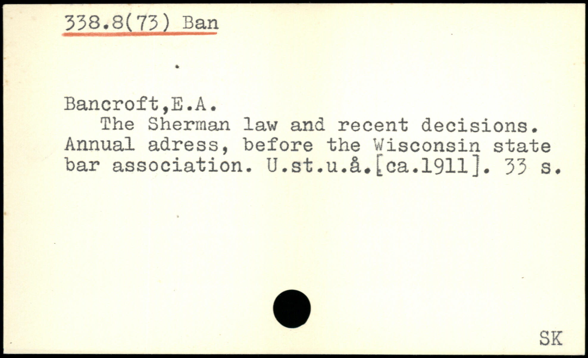 The Sherman law and recent decisions. Annual adress, before the Wisconsin state bar association. U.st.u.li. [ca.1911].