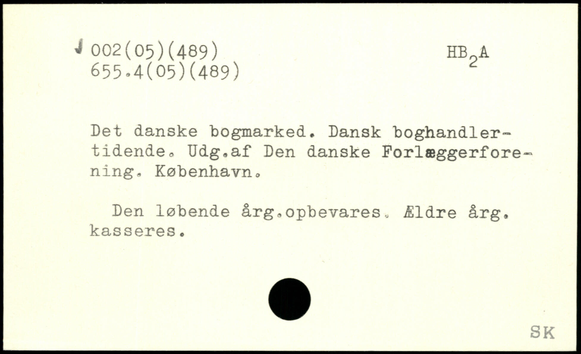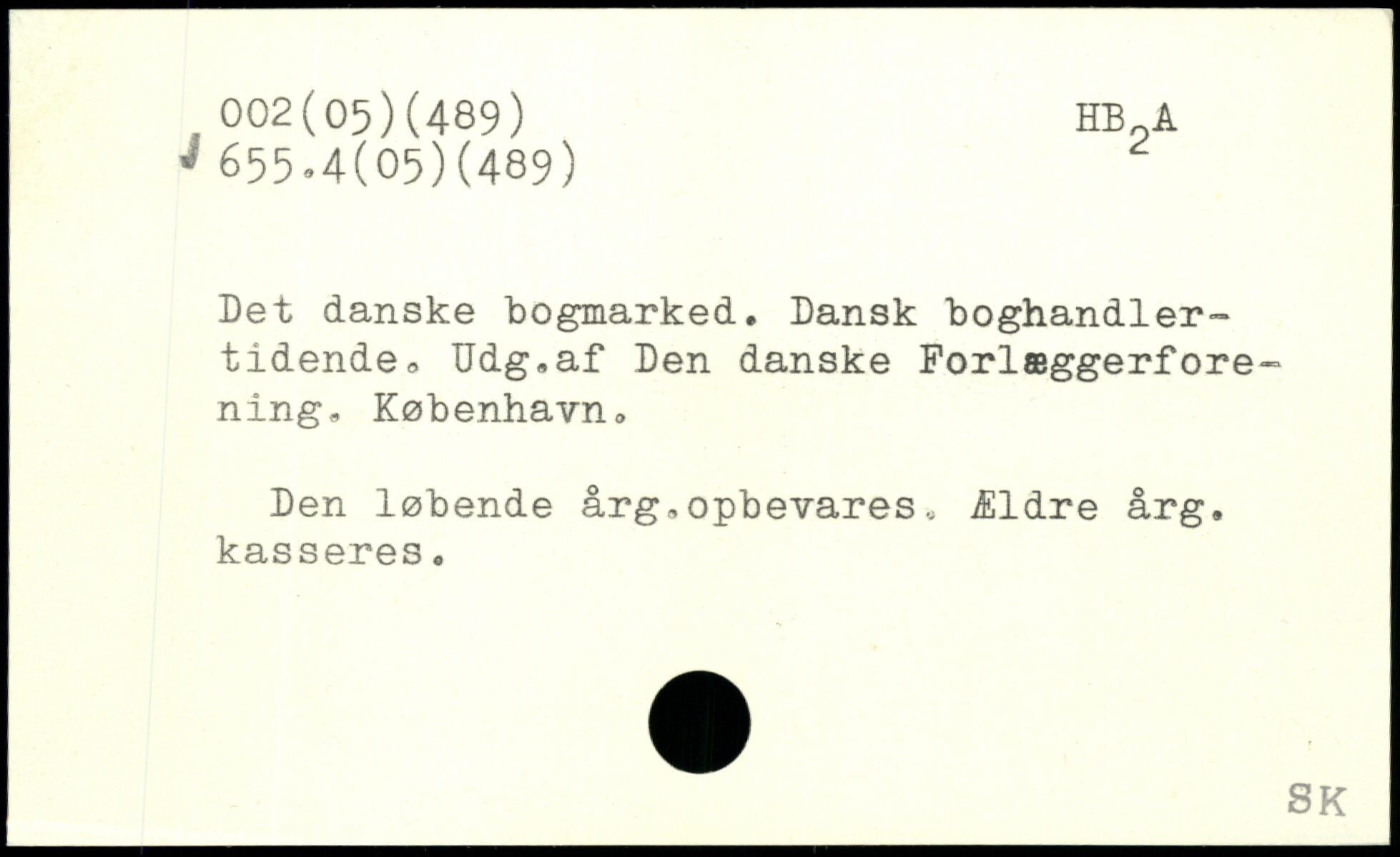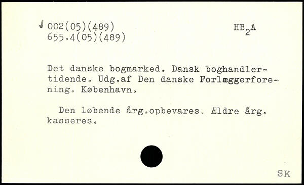 Det danske bogmarked. Dansk boghandler-tidende, Udg.af Den danske Forlæggerfore-ning, København. Den løbende årg.opbevares, Ældre årg. kasseres.