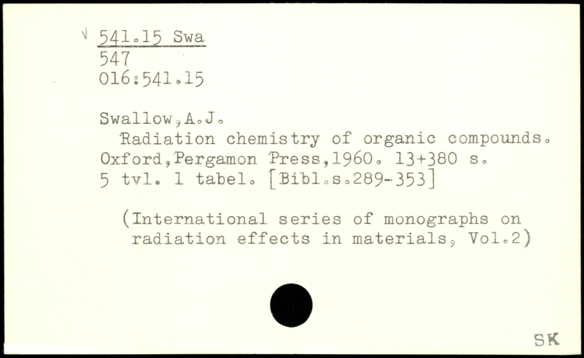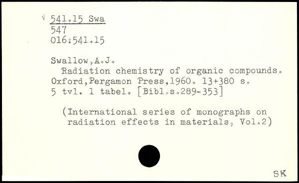 Swallow9AoJ, Radiation chemistry of organic compounds, Oxford,Pergamon 'Press,1960=