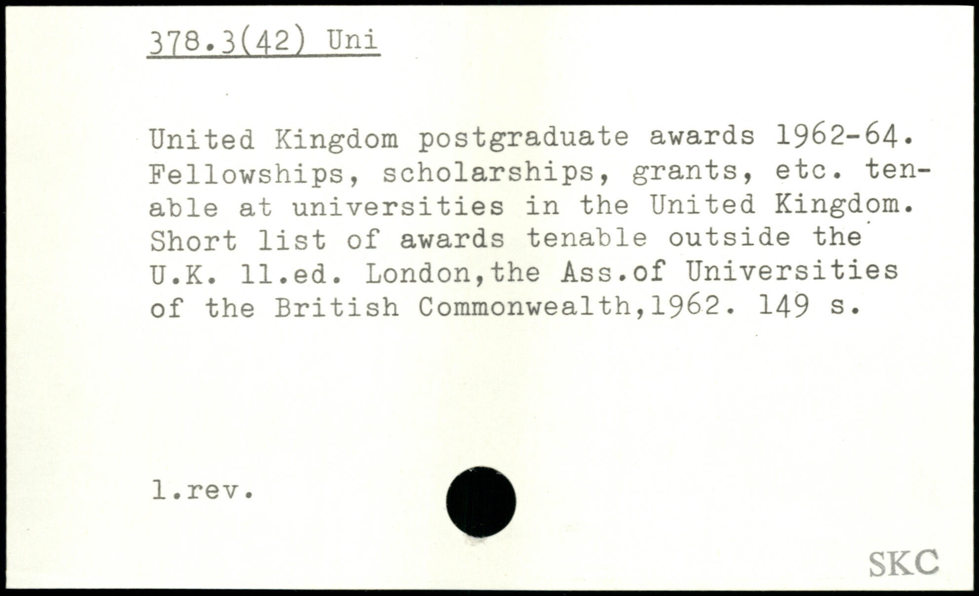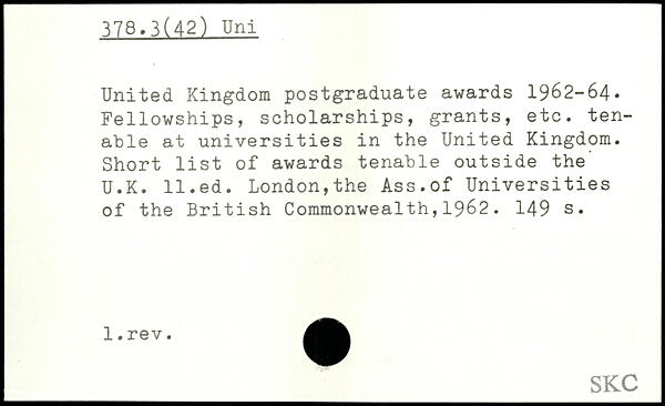 United Kingdom postgraduate awards 1962-64. Fellowships, scholarships, grants, etc. tenable at universities in the United Kingdom. Short list of awards tenable outside the U.K.