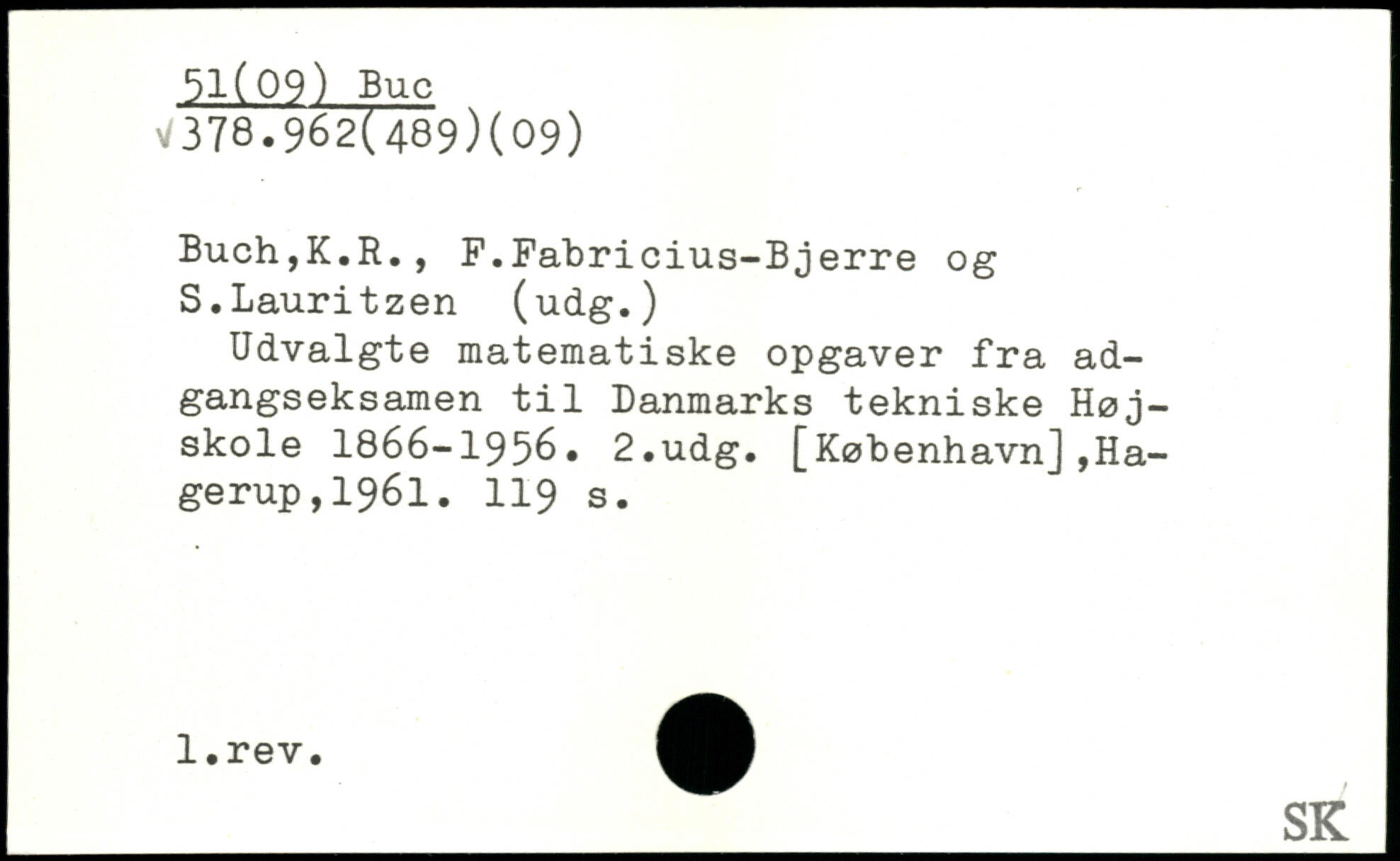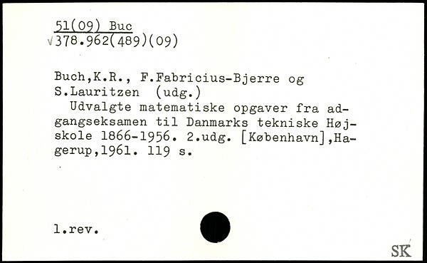 Buch,K.R., F.Fabricius-Bjerre og S.Lauritzen (udg.) Udvalgte matematiske opgaver fra adgangseksamen til Danmarks tekniske Højskole 1866-1956.