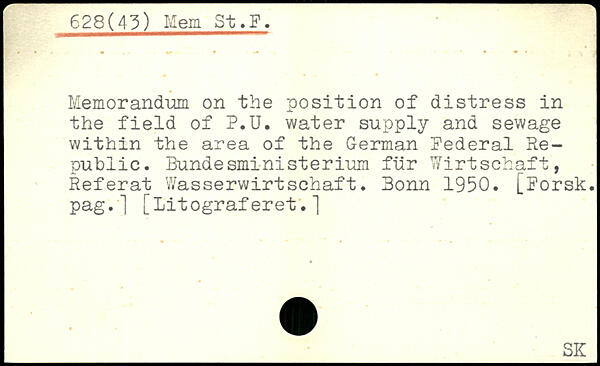 Memorandum on the position of distress in the field of P.U. water supply and sewage within the area of the German Federal Republic. Bundesministerium für Wirtschaft, Referat Wasserwirtschaft. Bonn 1950.
