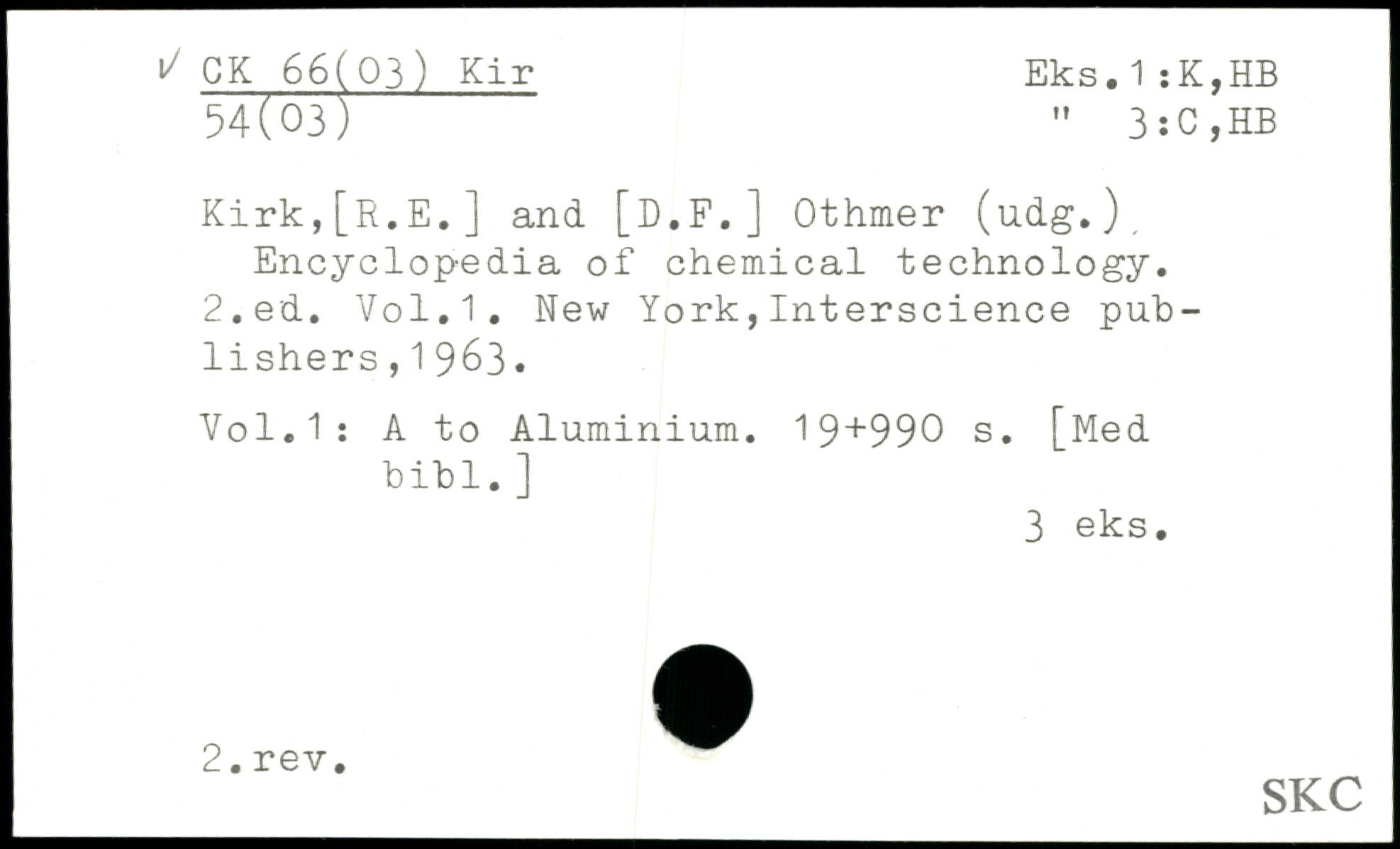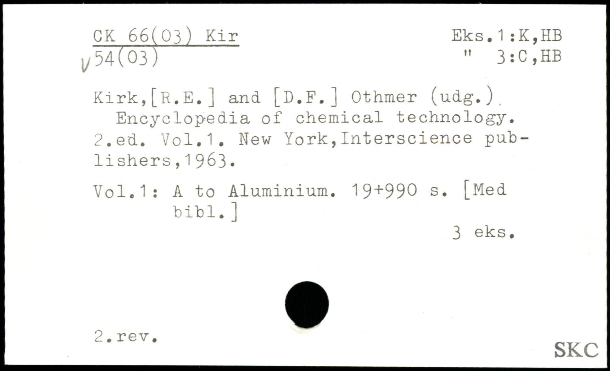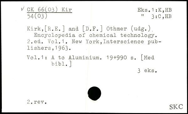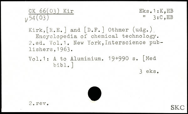 I/ 54(03 ) " 3 :C ,HB Kirk,[R.E.] and [D.F.] Othmer (udg.)# Encyclopedia of chemical technology.