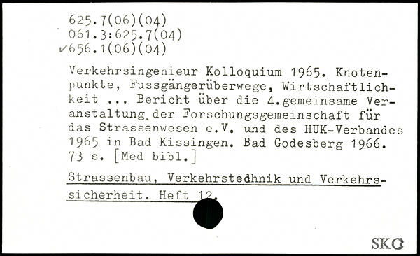 Verkehrsingenieur Kolloquium 1965. Knotenpunkte, Fussgängerüberwege, Wirtschaftlichkeit ... Bericht über die 4.gemeinsame Ver-anstaltung^der Forschungsgemeinschaft für das Strassenwesen e.V. und des HUK-Verbandes 1965 in Bad Kissingen. Bad Godesberg 1966.
