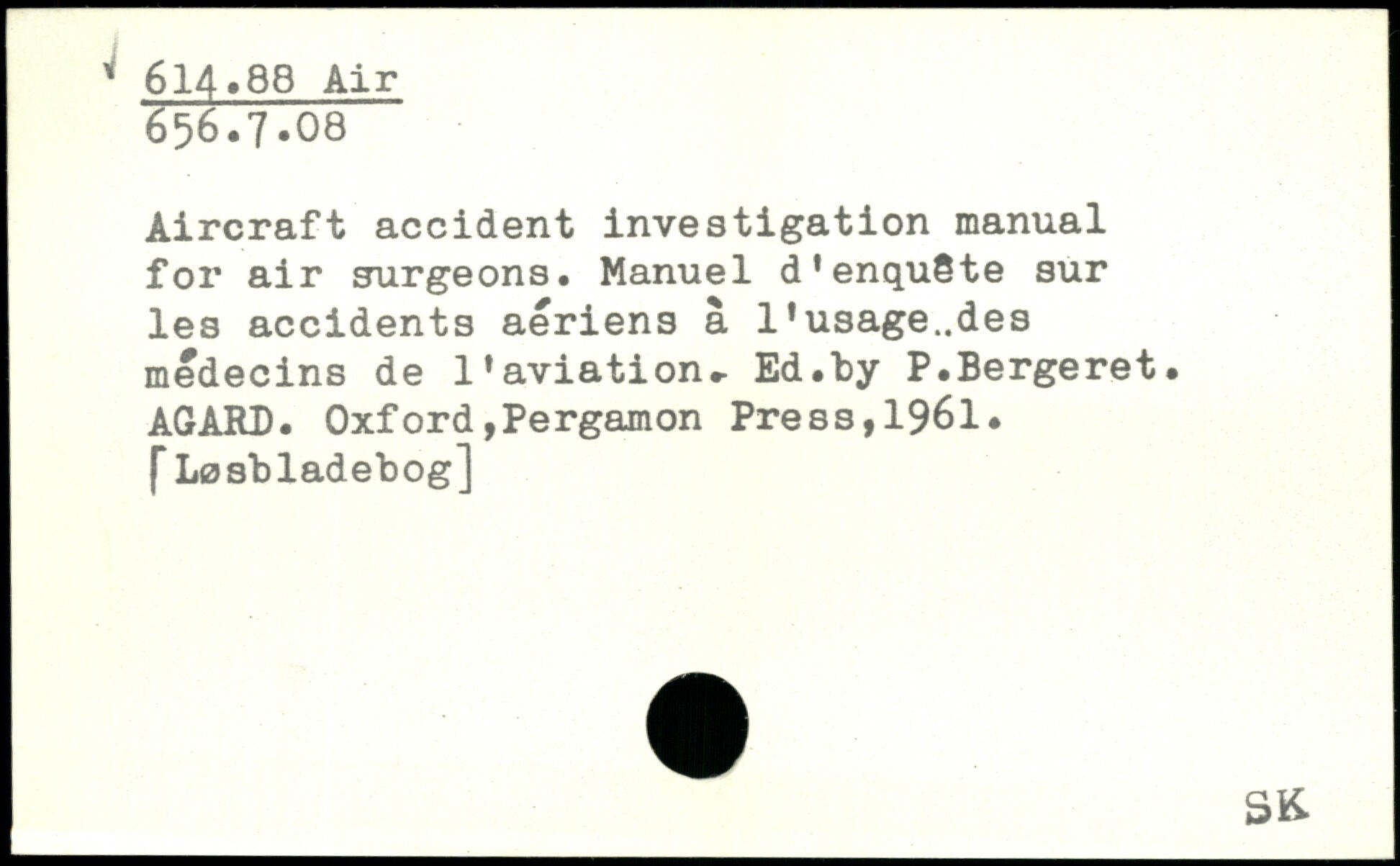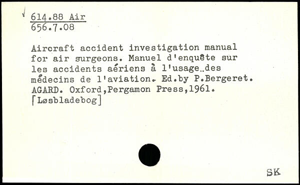 Aircraft accident investigation manual for air surgeons. Manuel d'enquête sur les accidents aériens â l'usage..des médecins de l'aviation.- Ed.by P.Bergeret. AGARD. OxfordjPergamon Press,1961. f Løsbladebog]