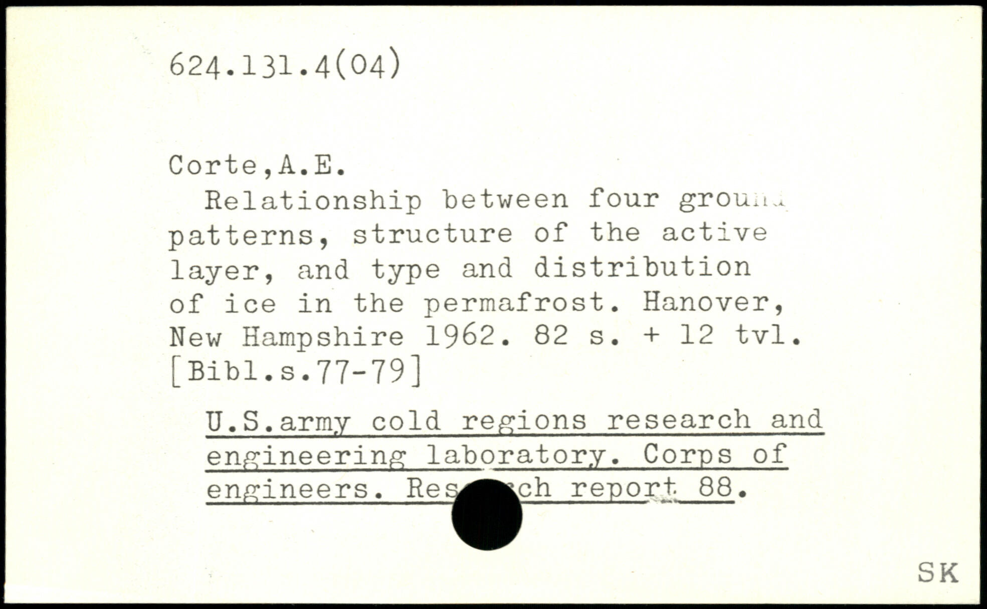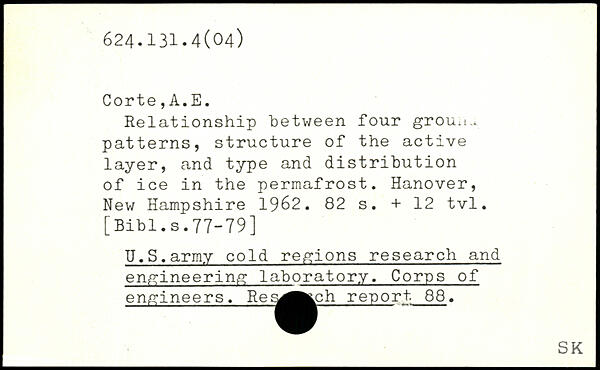 Relationship between four grou.u patterns, structure of the active layer, and type and distribution of ice in the permafrost. Hanover, New Hampshire 1962.