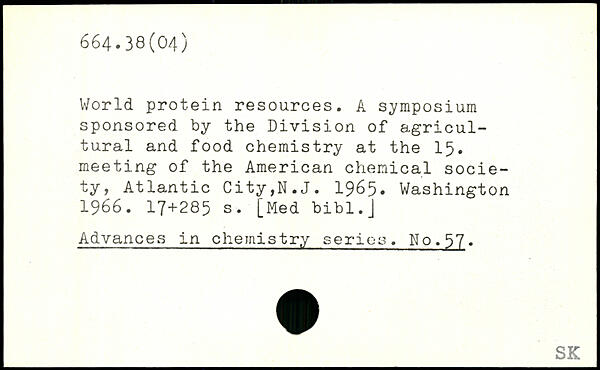 World protein resources. A symposium sponsored by the Division of agricultural and food chemistry at the 15. meeting of the American chemical society, Atlantic City,N.J. 1965.