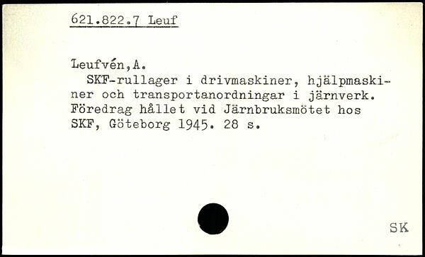 SKF-rullager i drivmaskiner, hjälpmaskiner och transportanordningar i järnverk. Föredrag hållet vid Järnbruksmötet hos SKF, Göteborg 1945