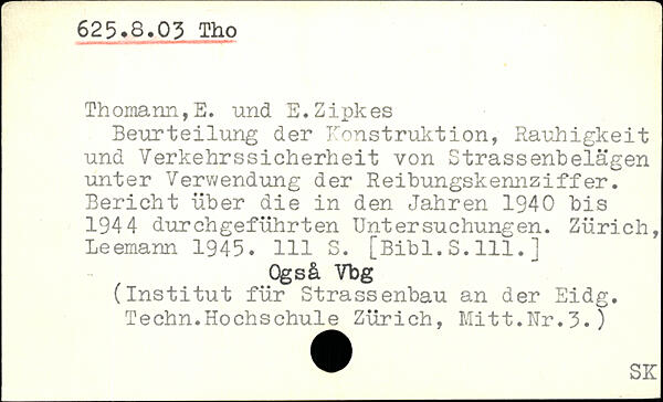 Th omann,S. und E. Z ipkes Beurteilung der Konstruktion, Rauhigkeit und Verkehrssicherheit von Strassenbelägen unter Verwendung der Reibungskennziffer. Bericht über die in den Jahren 1940 bis 1944 durchgeführten Untersuchungen. Zürich, Leemann 1945.