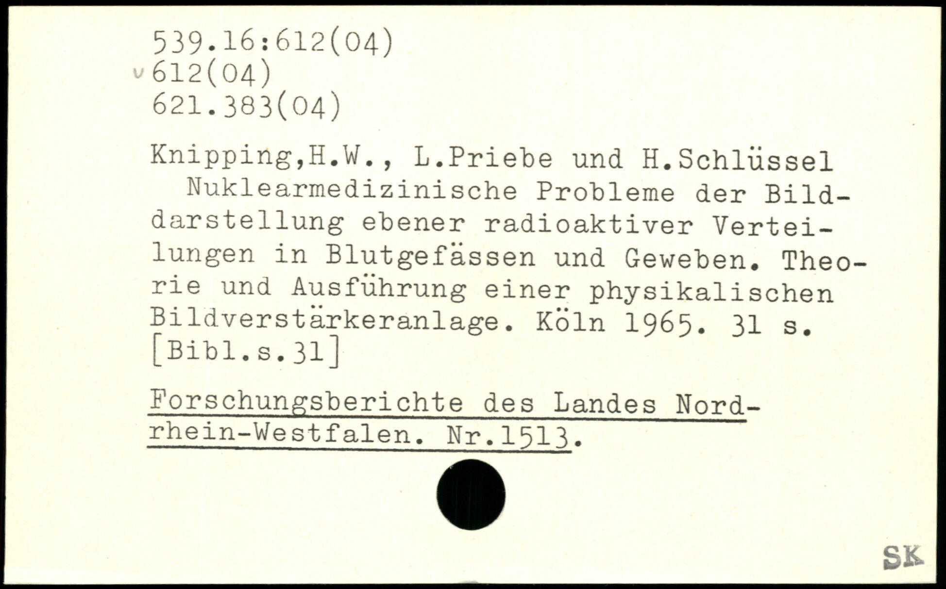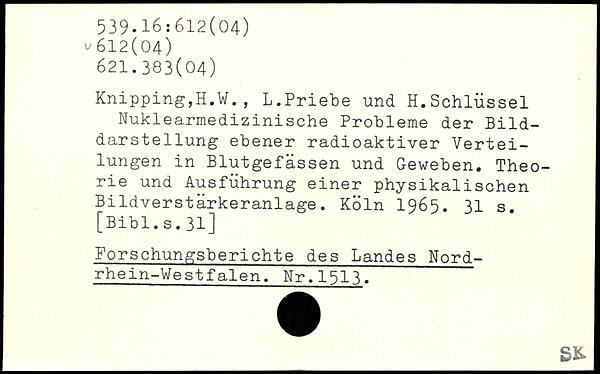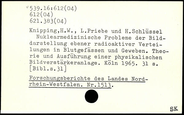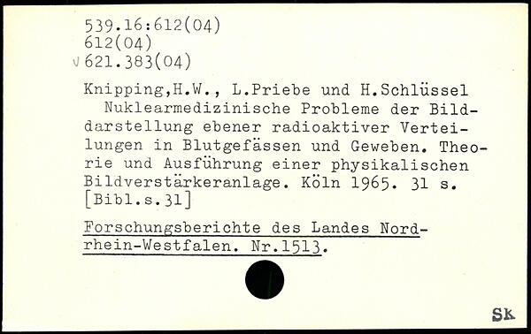 Knipping,H.W., L.Priebe und H.Schlüssel Nuklearmedizinische Probleme der Bilddarstellung ebener radioaktiver Verteilungen in Blutgefässen und Geweben. Theorie und Ausführung einer physikalischen Bildverstärkeranlage.