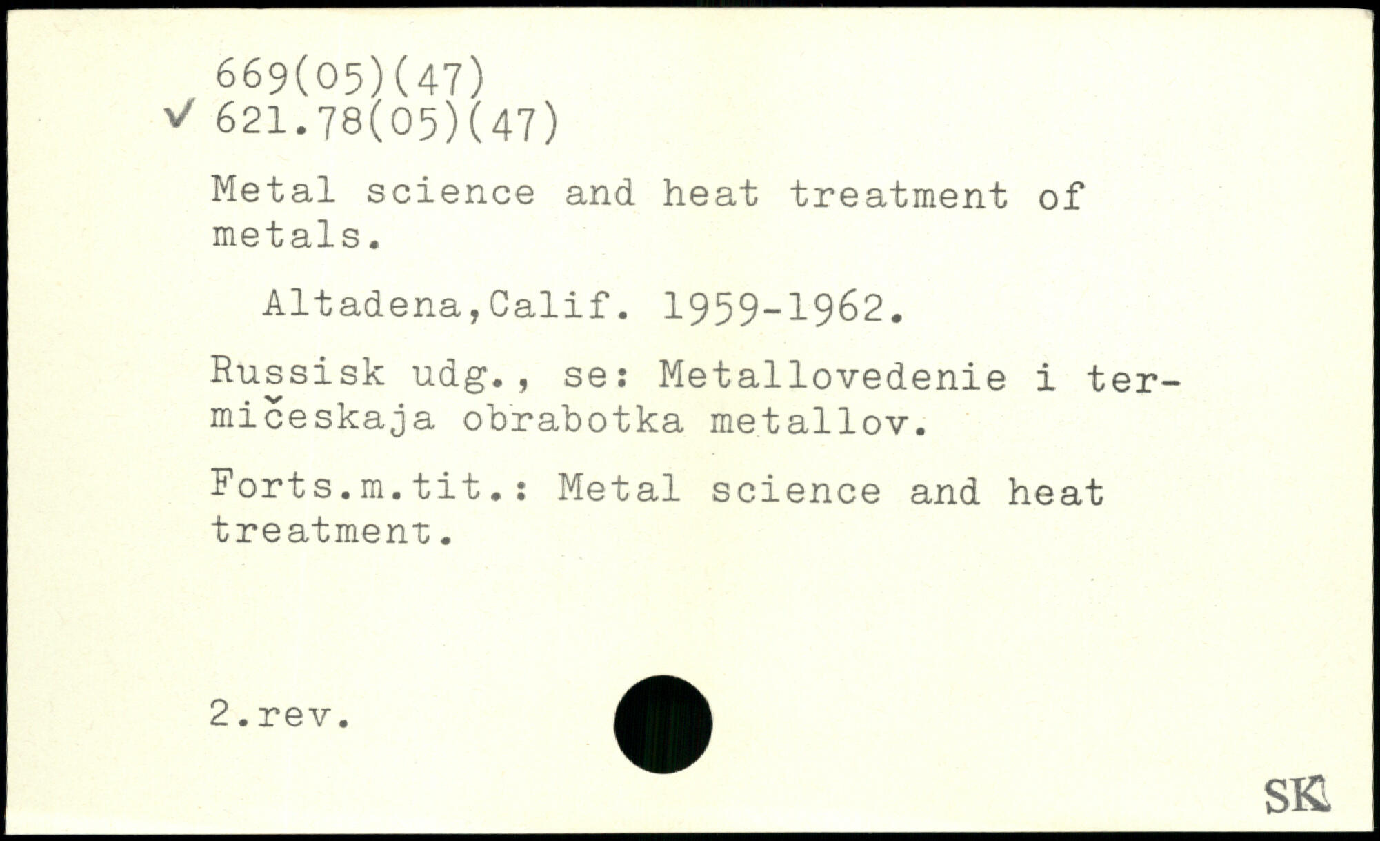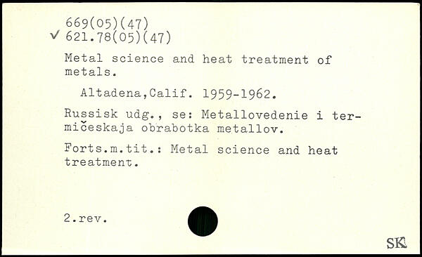 Metal science and heat treatment of metals. Altadena,Calif. 1959-1962. Russisk udg. , se: Metallovedenie i ter-miceskaja obrabotka metallov. Forts.m.tit.: Metal science and heat treatment. _SKI