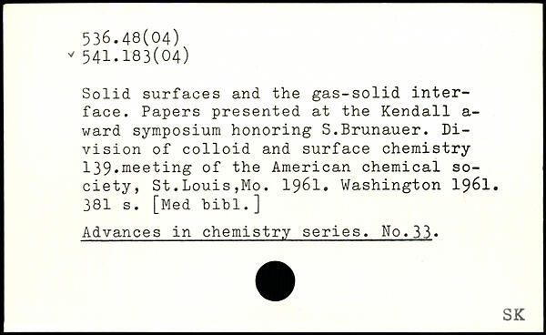 Solid surfaces and the gas-solid interface. Papers presented at the Kendall a-ward symposium honoring S.Brunauer. Division of colloid and surface chemistry 139.meeting of the American chemical society, St.Louis,Mo. 1961.