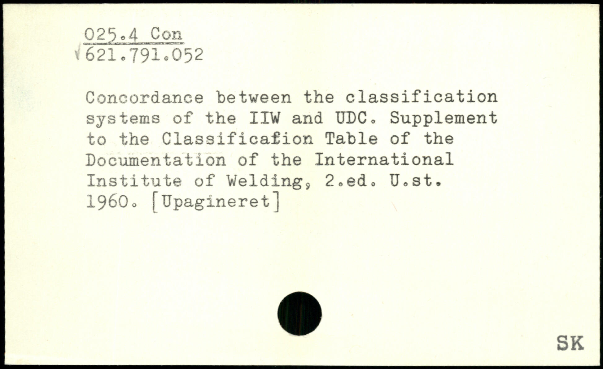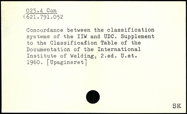 Concordance “between the classification systems of the IIW and UDC, Supplement to the Classification Table of the Documentation of the International Institute of Weldingy 2,ed. U,st. 1960, [tJpagineret]