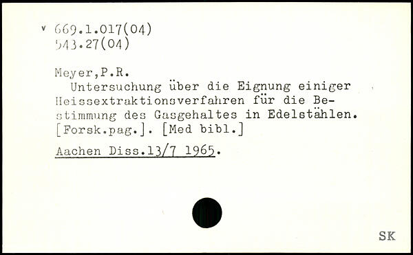 Untersuchung über die Eignung einiger Heissextraktionsverfahren für die Bestimmung des Gasgehaltes in Edelstahlen. [Forsk.pag.J. [Med bibl.] Aachen Diss.ll/7 1965.