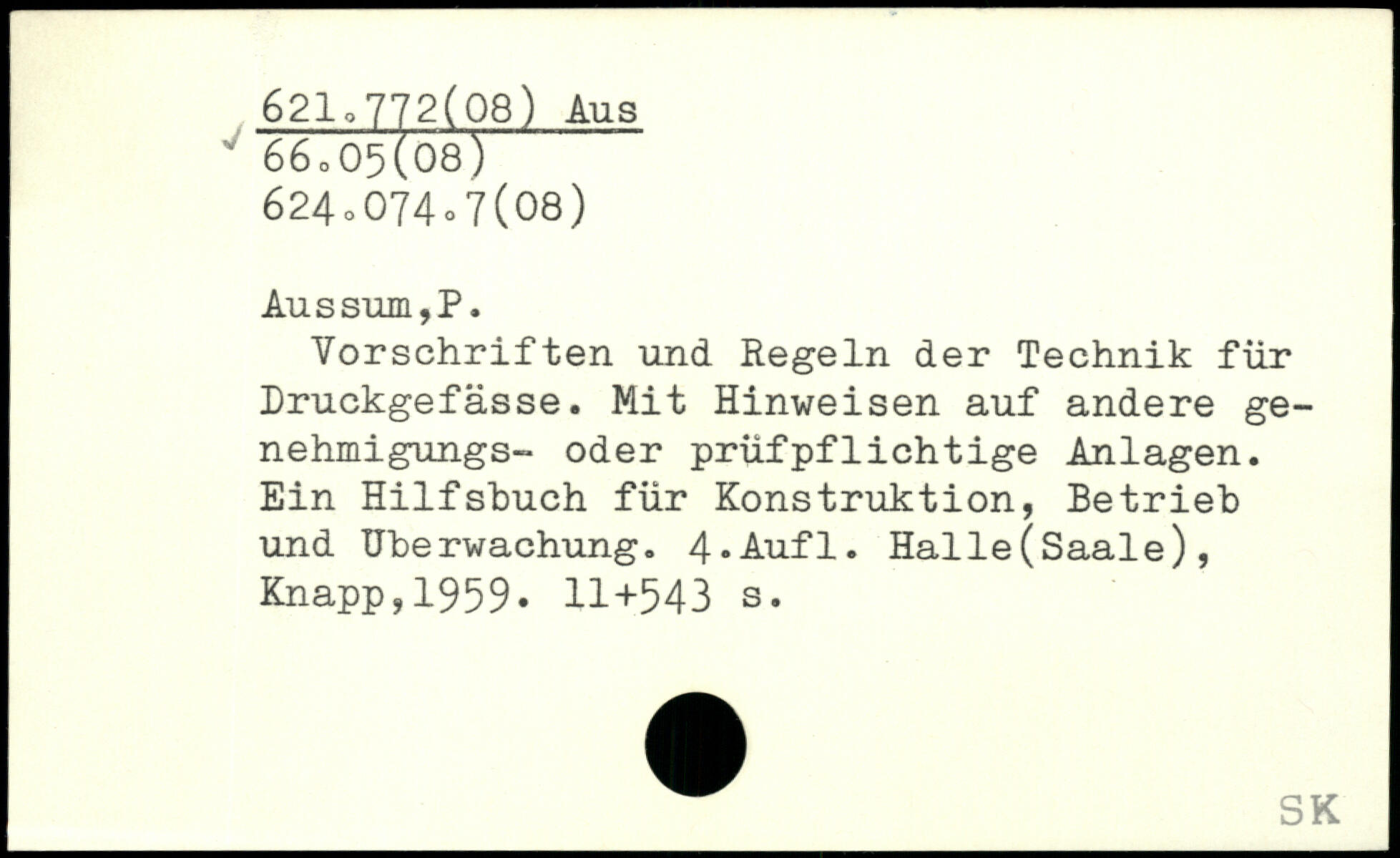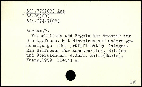 Vorschriften und Regeln der Technik für Druckgefässe. Mit Hinweisen auf andere ge-nehmigungs- oder prüfpflichtige Anlagen. Ein Hilfsbuch für Konstruktion, Betrieb und Überwachung. 4-Aufl. Halle(Saale), j Knapp,1959