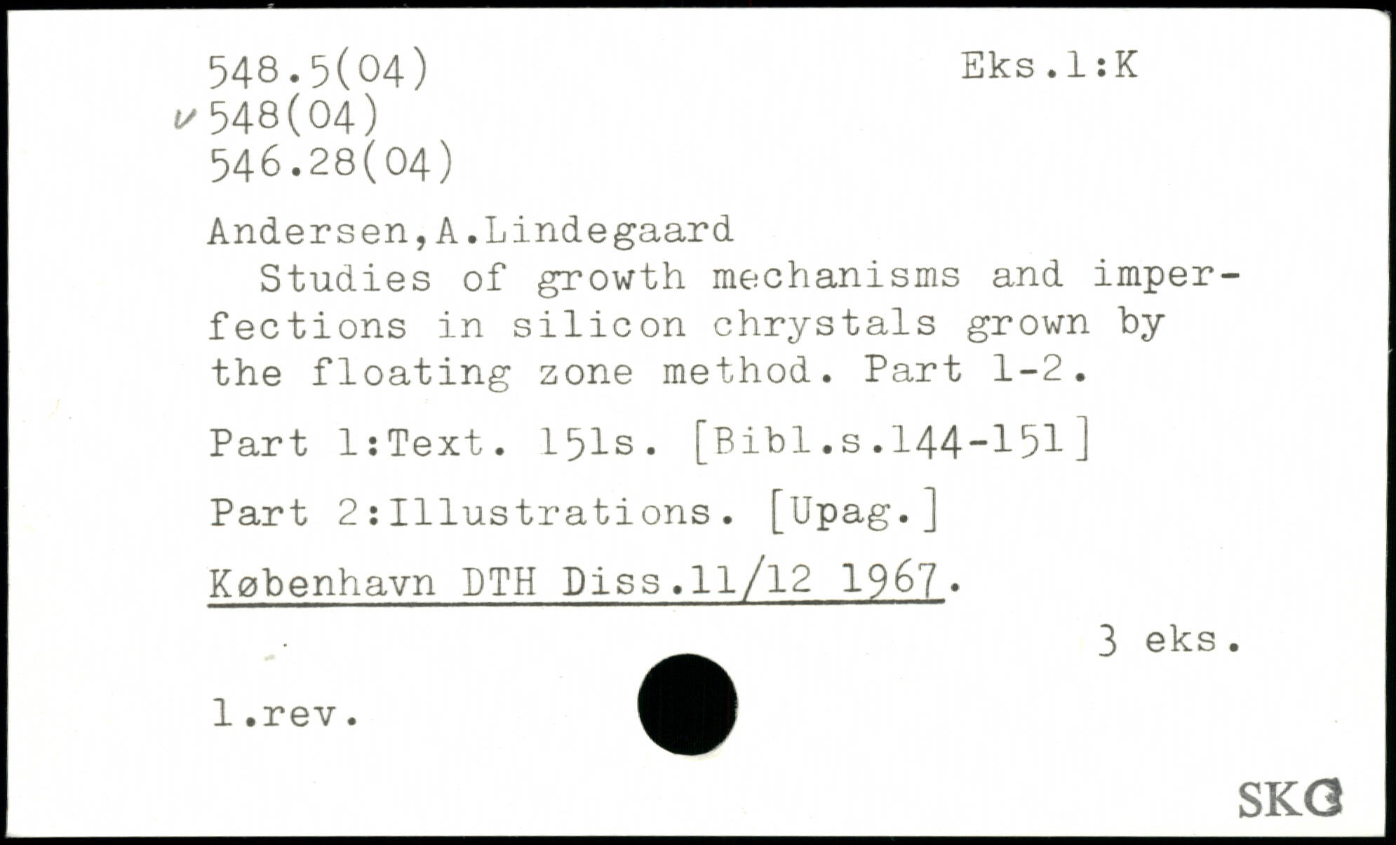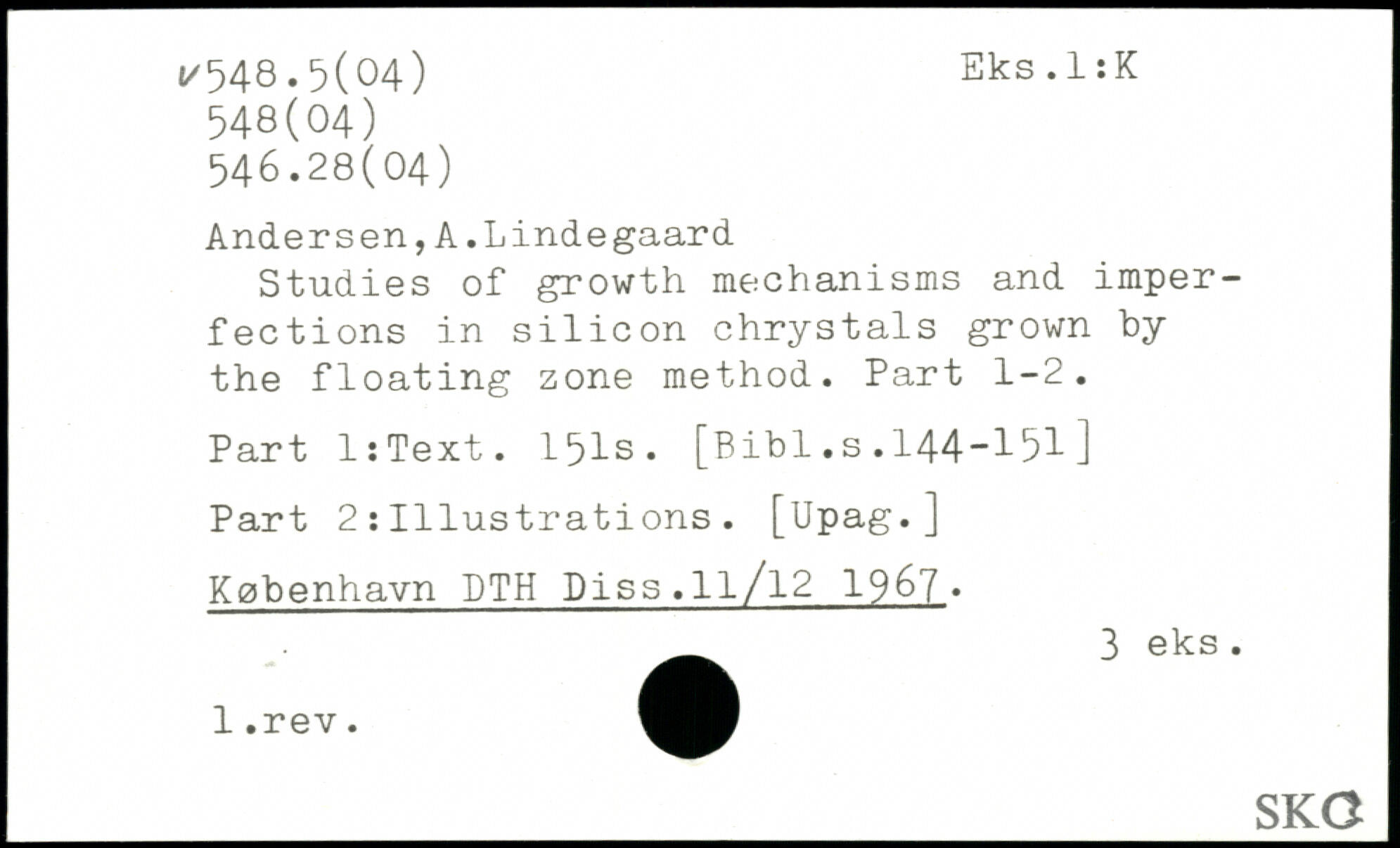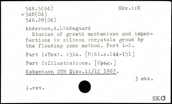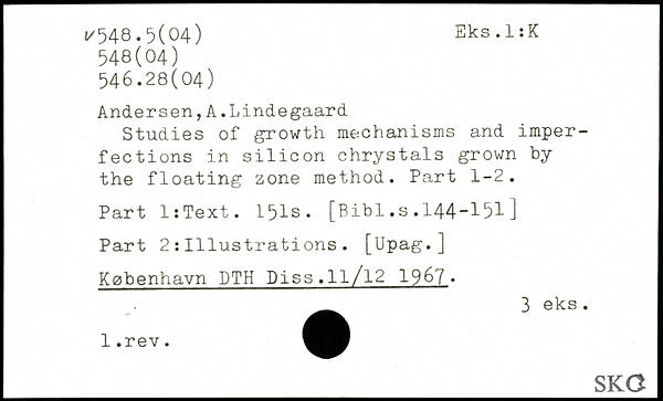Andersen,A.Lindegaard Studies of growth mechanisms and imperfections in silicon chrystals grown by the floating zone method. Part 1-2. Part l:Text. 151s.