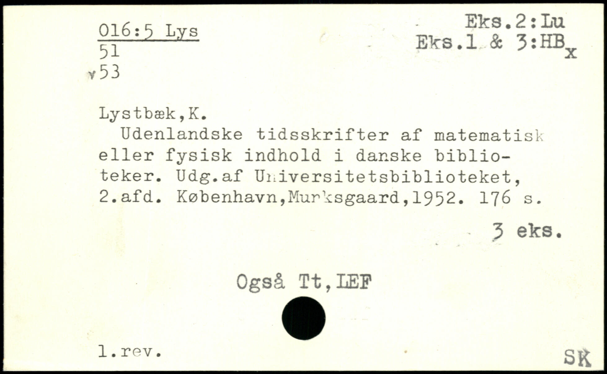 m/r.c t___ - Eks.2:Lu 7 EVs.l & 3:HBX y53 Lystbæk,K. Udenlandske tidsskrifter af matematisk eller fysisk indhold i danske biblioteker. Udg.af Universitetsbiblioteket, 2.afd.