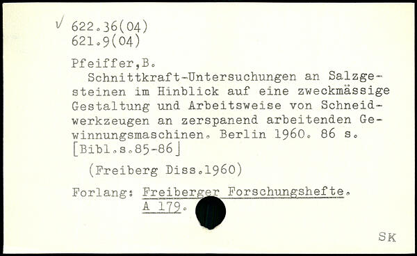 Schnittkraft-Untersuchungen an Salzgesteinen im Hinblick auf eine zweckmässige Gestaltung und Arbeitsweise von Schneidwerkzeugen an zerspanend arbeitenden Gewinnungsmaschinen o