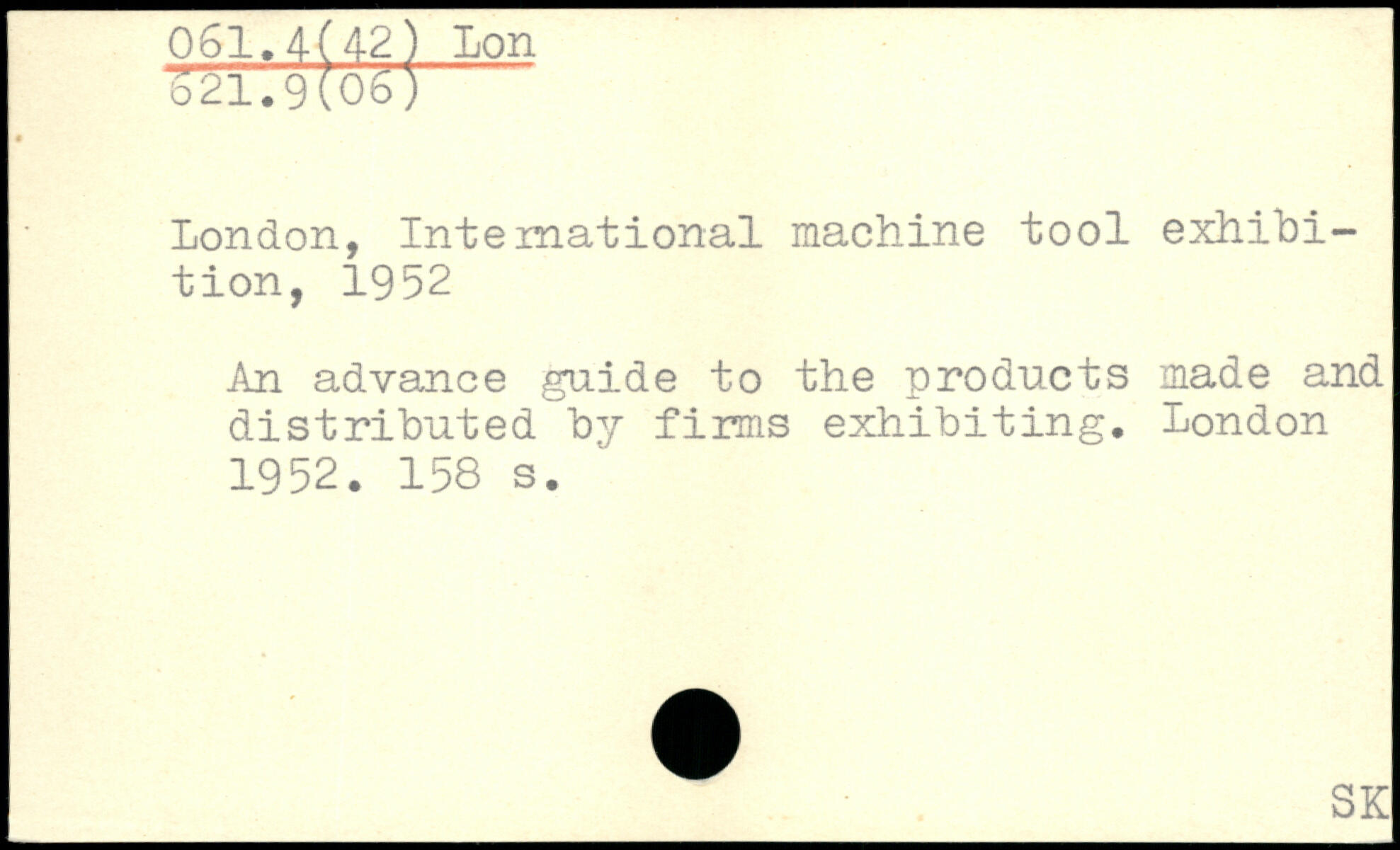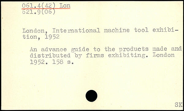 London, International machine tool exhihi-tion, 1952 An advance guide to the products made and distributed by firms exhibiting, London 1952. 158 s.
