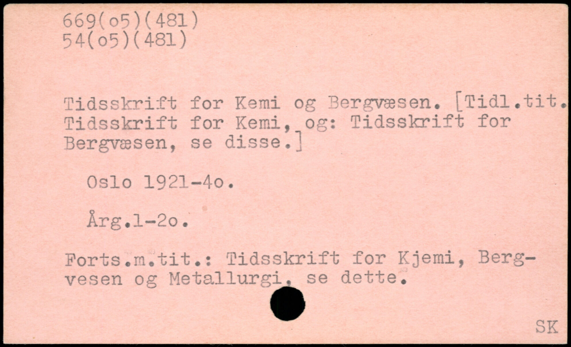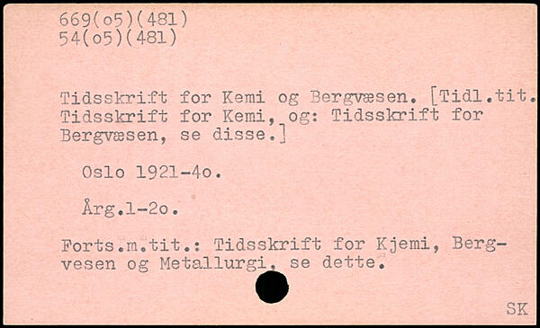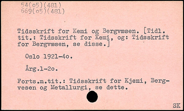 Tidsskrift for Kemi og Bergvæsen. [Tidl. tit.: Tidsskrift for Kemi, og: Tidsskrift for Bergvæsen, se disse.] Oslo 1921-40. Årg.l-2o. Korts.m.tit.: Tidsskrift for Kjemi, Berg-vesen og Metallurgi, se dette.