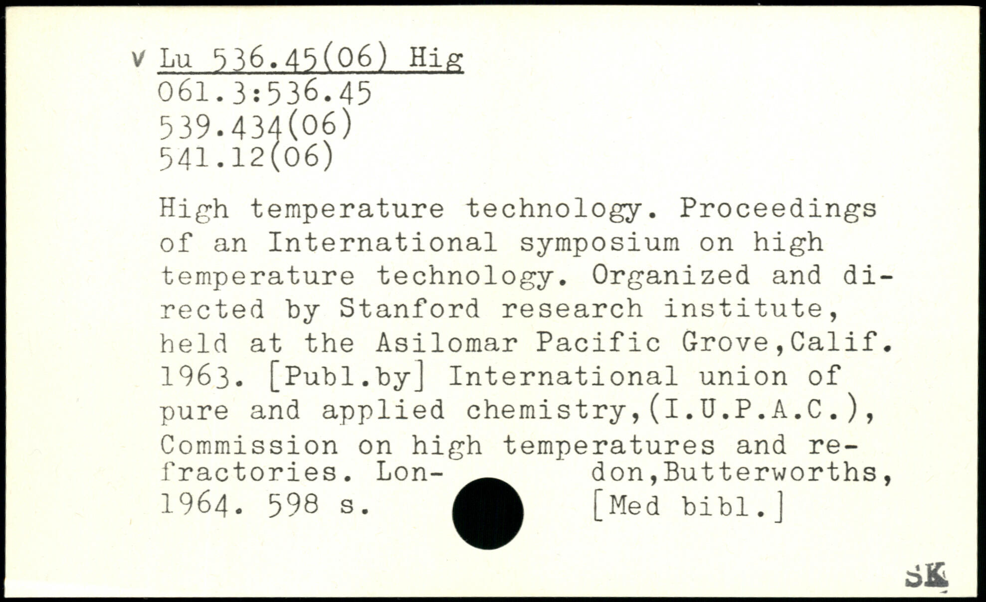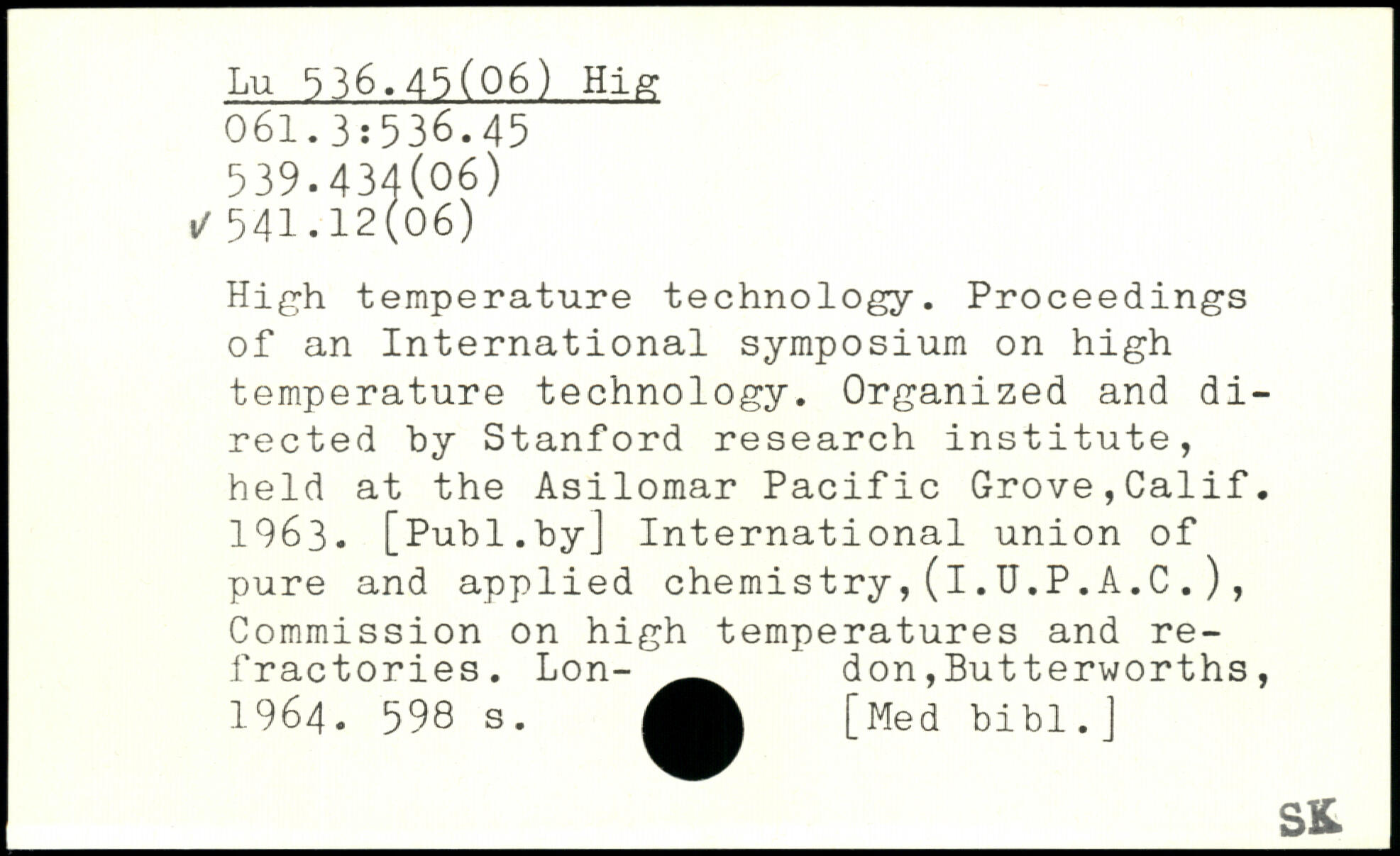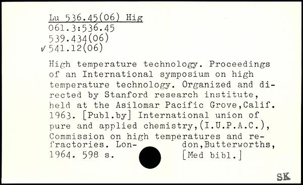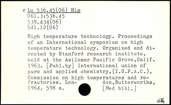High temperature technology. Proceedings of an International symposium on high temperature technology. Organized and directed by Stanford research institute, held at the Asilomar Pacific Grove,Calif. 1963.