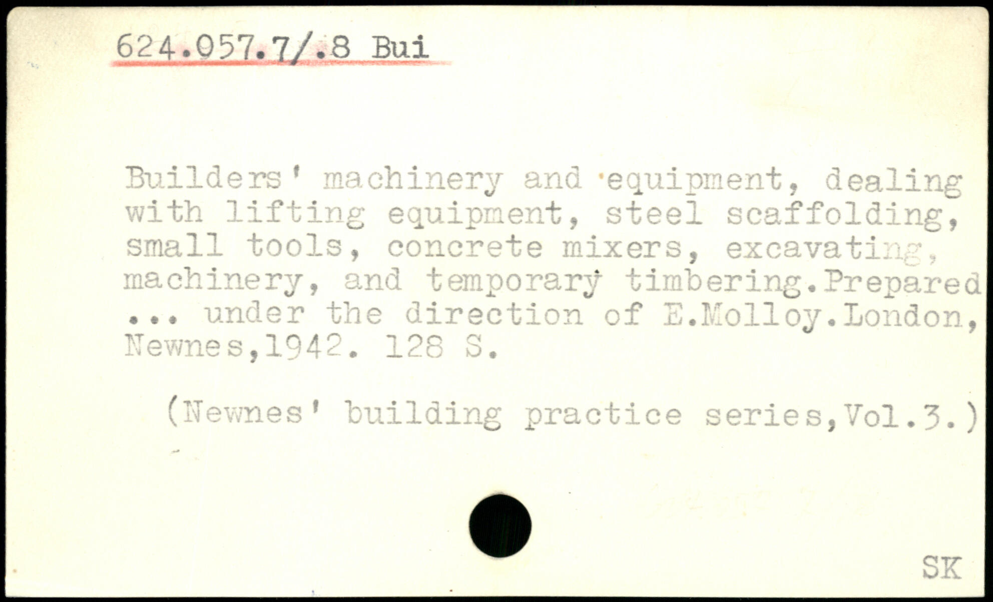 Builders. machinery and 'equipment, dealing with lifting equipment, steel scaffolding, small tools, concrete mixers, excavating, machinery, and temporary timbering.Prepared ... under the direction of E.Molloy.