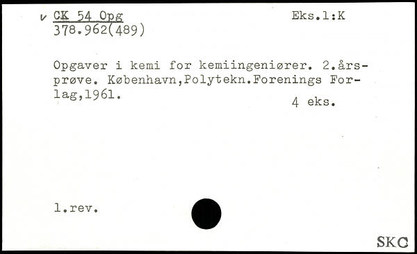 Opgaver i kemi for kemiingeniører. 2.årsprøve. København,Polytekn.Forenings For- lag>1361- 4 eks.
