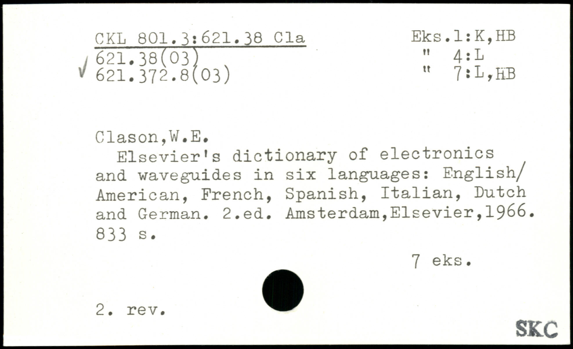 Elsevier's dictionary of electronics and waveguides in six languages: English/ American, French, Spanish, Italian, Butch and German. 2,ed.