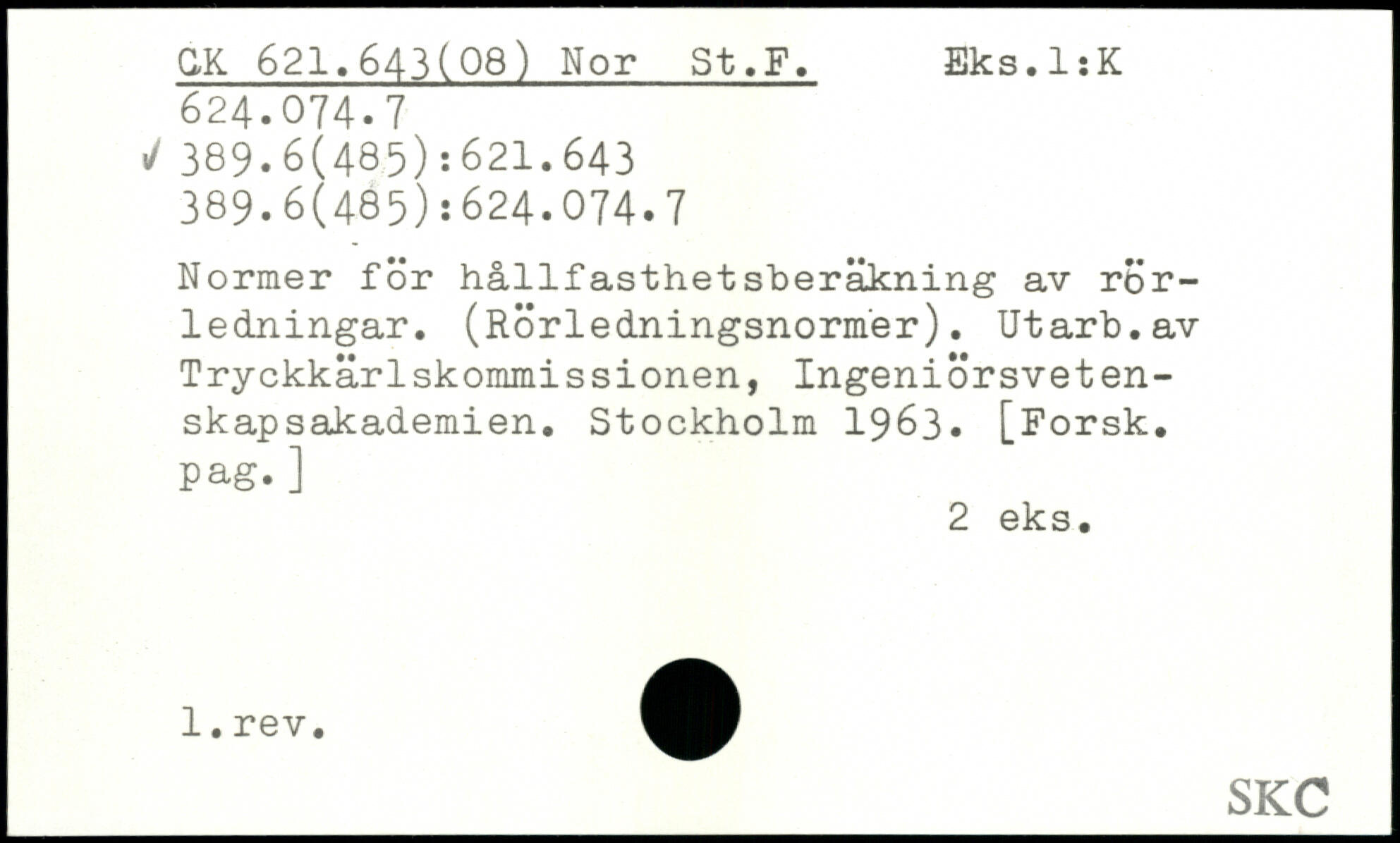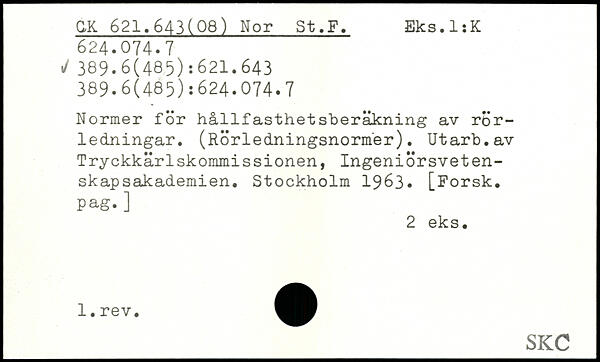 Normer för hållfasthetsberäkning av rörledningar. (Rörledningsnormér). Utarb.av Tryckkärlskommissionen, Ingeniörsveten-skapsakademien.