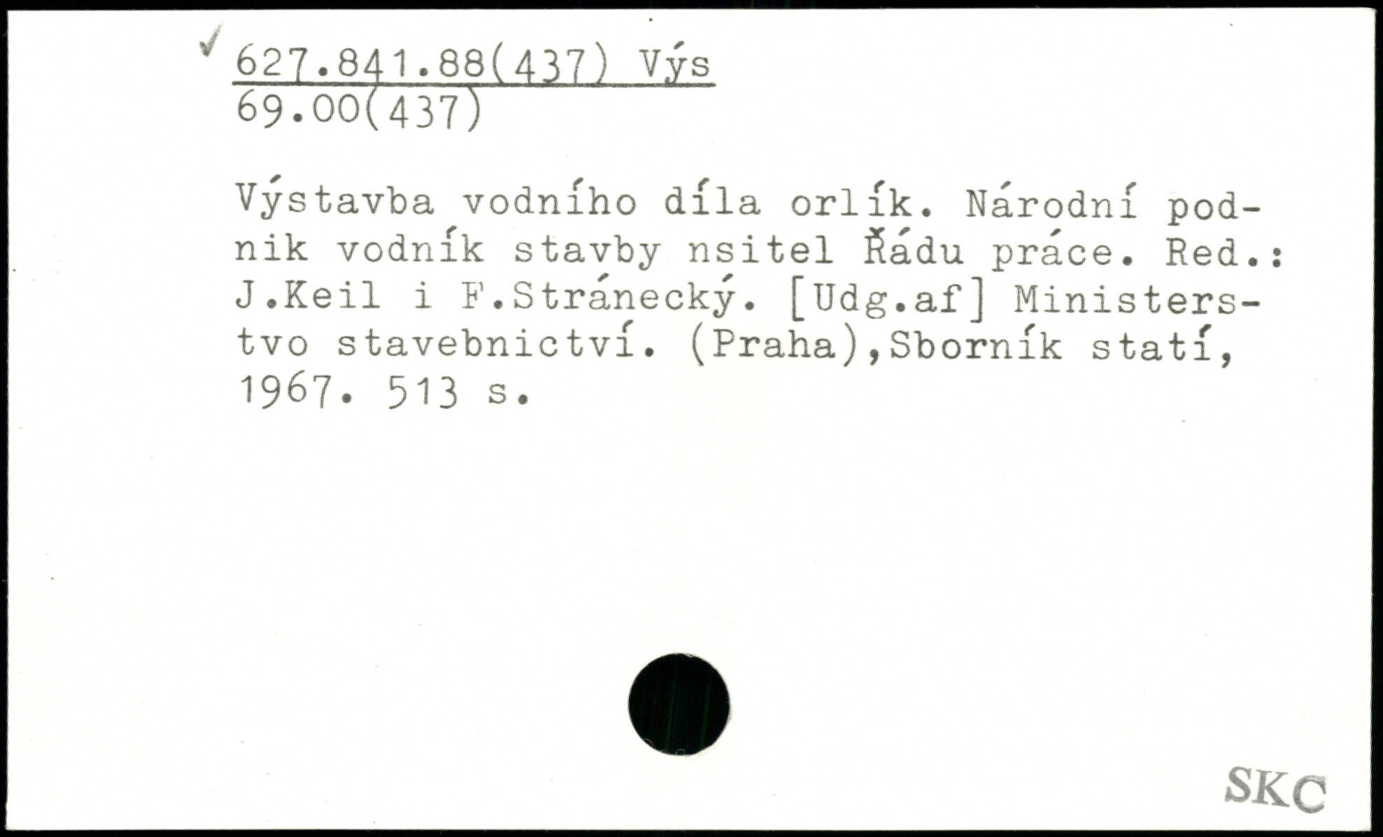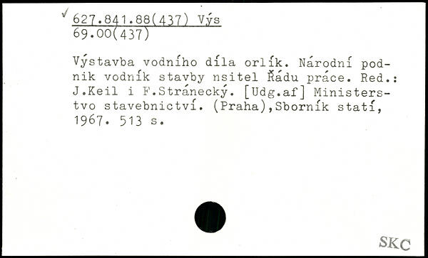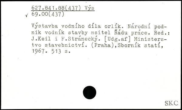 Vystavba vodniho dila orlik. Narodni pod-nik vodnik stavby nsitel $adu prace. Red.: J.Keil i F.Stranecky. [Udg.af] Ministers-tvo stavebnictvi. (Praha),Sbornik stati, 1967.