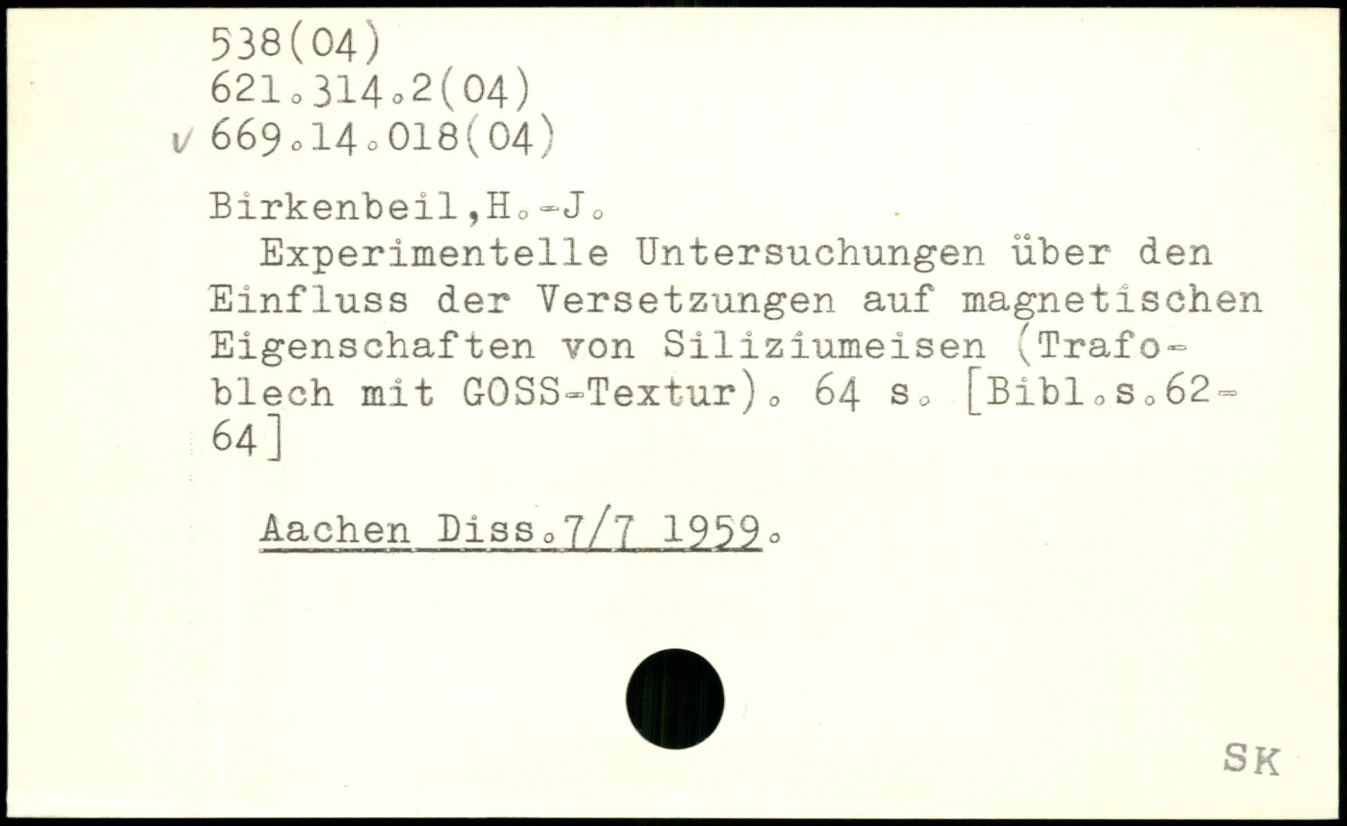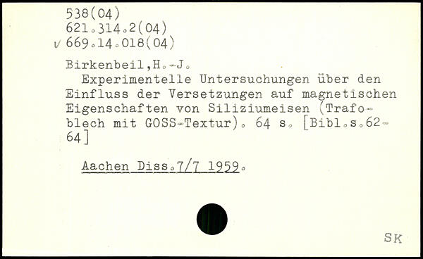 Birkenbeil,HC,J, Experimentelle Untersuchungen über den Einfluss der Versetzungen auf magnetischen Eigenschaften von Siliziumeisen (Trafoblech mit GOSS-Textur)0
