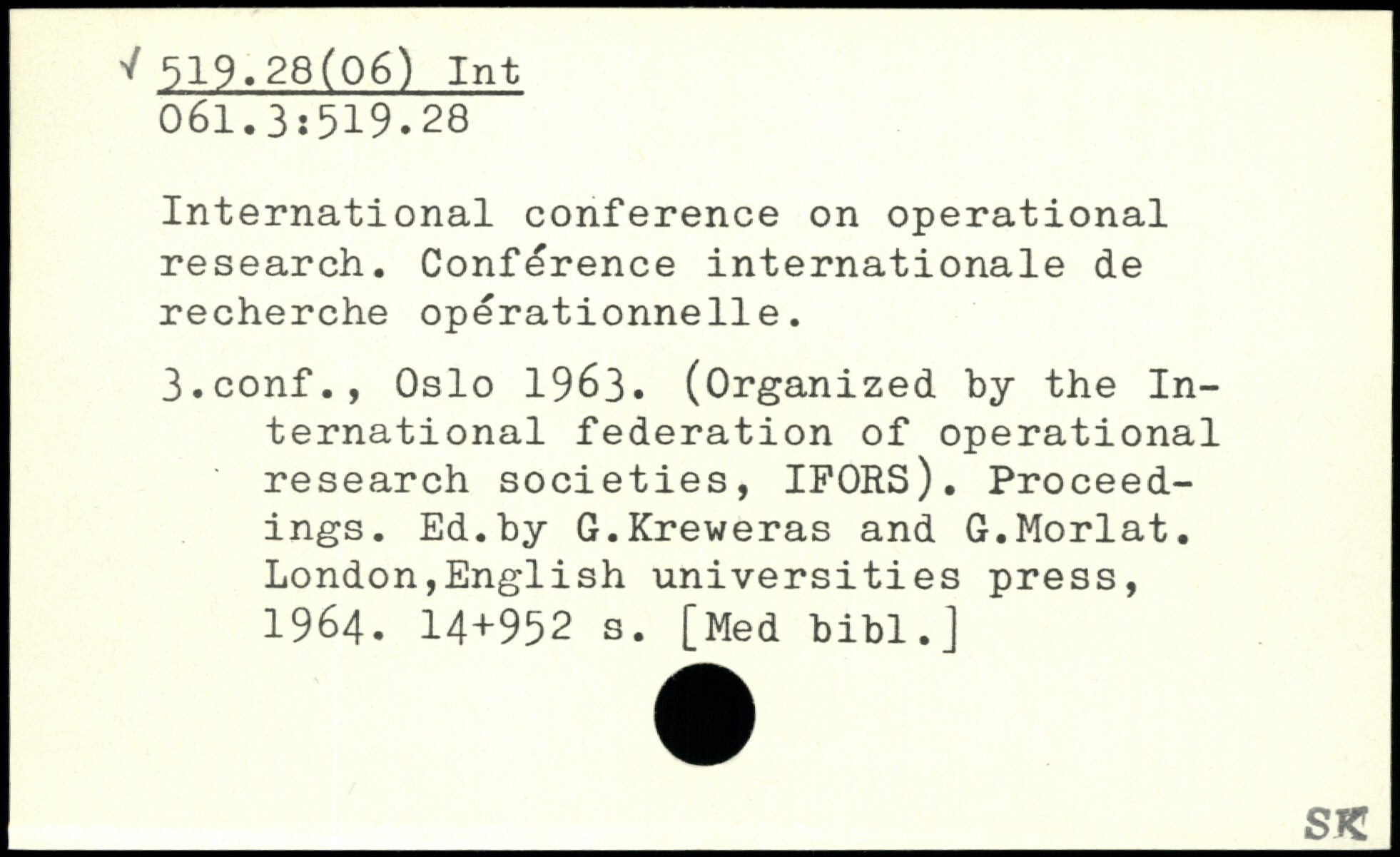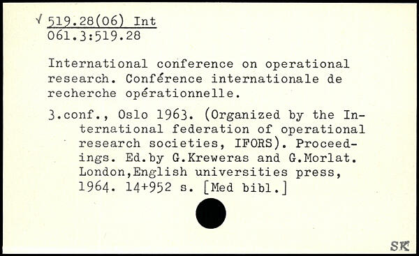 International conference on operational research. Conference internationale de recherche opérationnelle. 3.conf., Oslo 1963. (Organized by the International federation of operational research societies, IFORS). Proceedings. Ed.by G.Kreweras and G.Morlat.