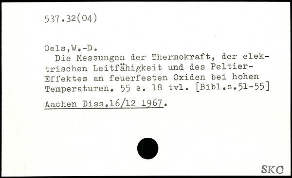 Die Messungen der Thermokraft, der elektrischen Leitfähigkeit und des Peltier-Effektes an feuerfesten Oxiden hei hohen Temperaturen.
