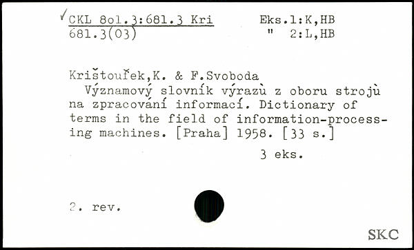 Vyznamovy slovnik vyrazu z oboru stroju na zpracovani informaci. Dictionary of terms in the field of information-processing machines.