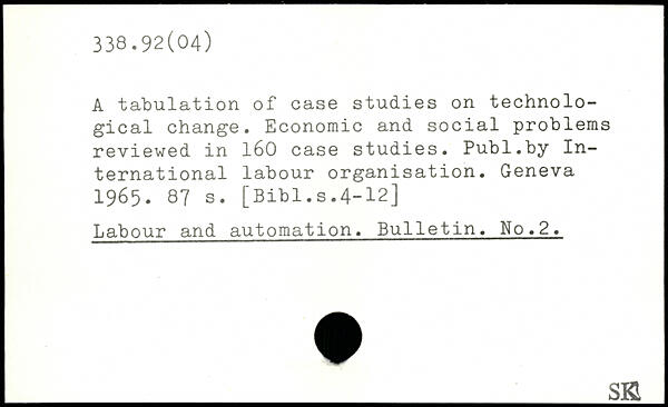A tabulation of case studies on technological change. Economic and social problems reviewed in 160 case studies.