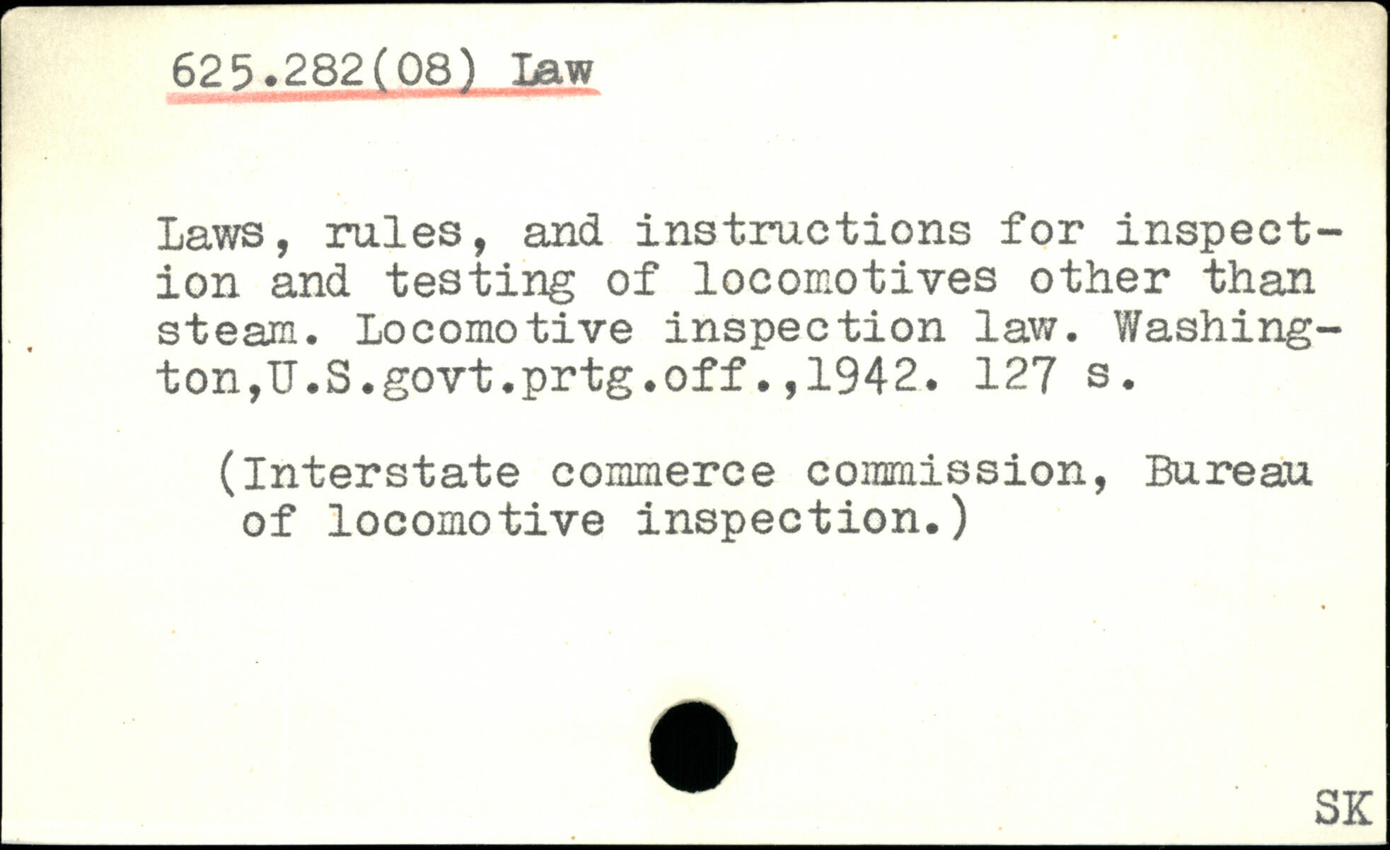 Laws, rales, and instructions for inspection and testing of locomotives other than steam. Locomotive inspection law. Washing-ton,U.S.govt.prtg.off.,1942.