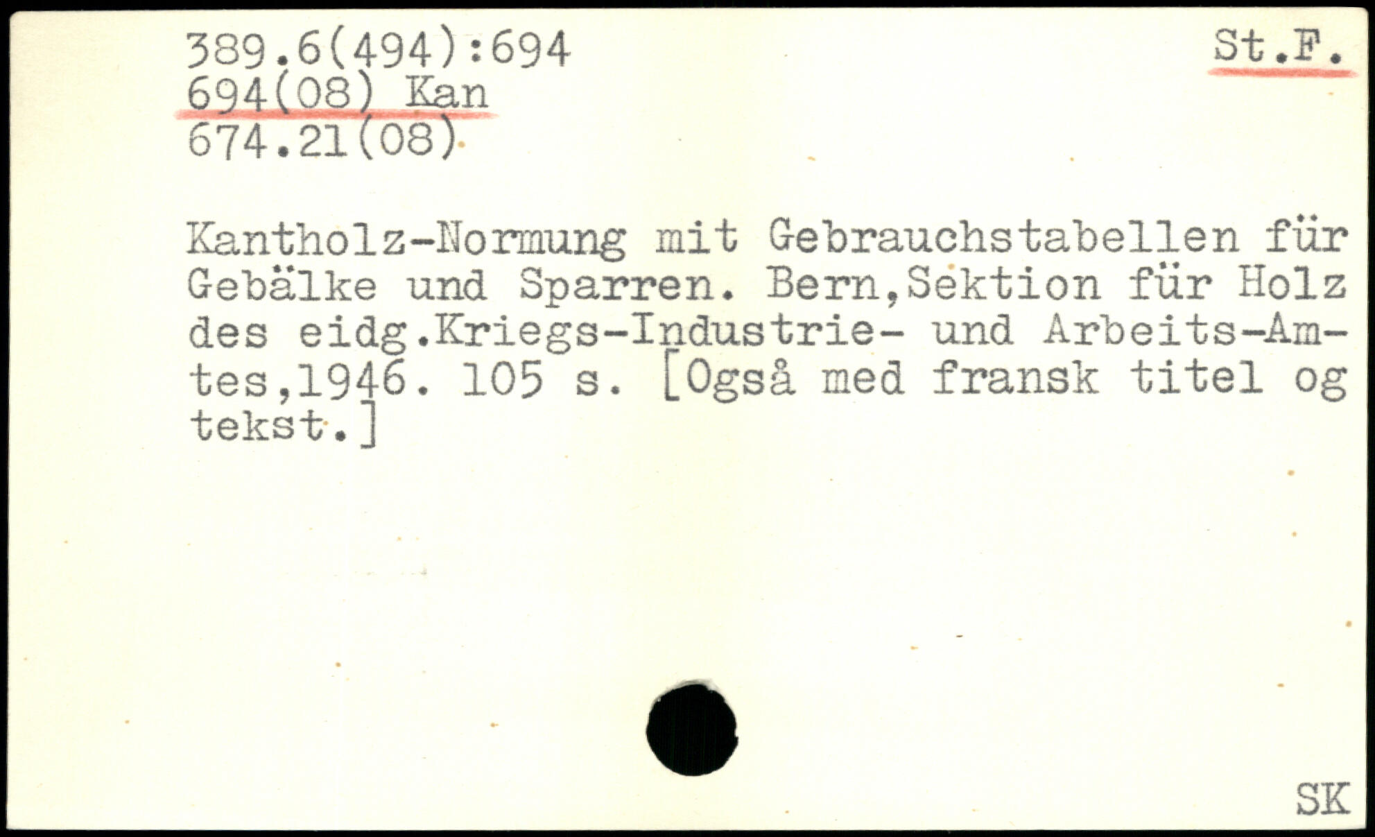 Kantholz-Normung mit Gebrauchstabeilen für Gebälke und Sparren. Bern,Sektion für Holz des eidg.Kriegs-Industrie- und Arbeits-Amtes, 1946.