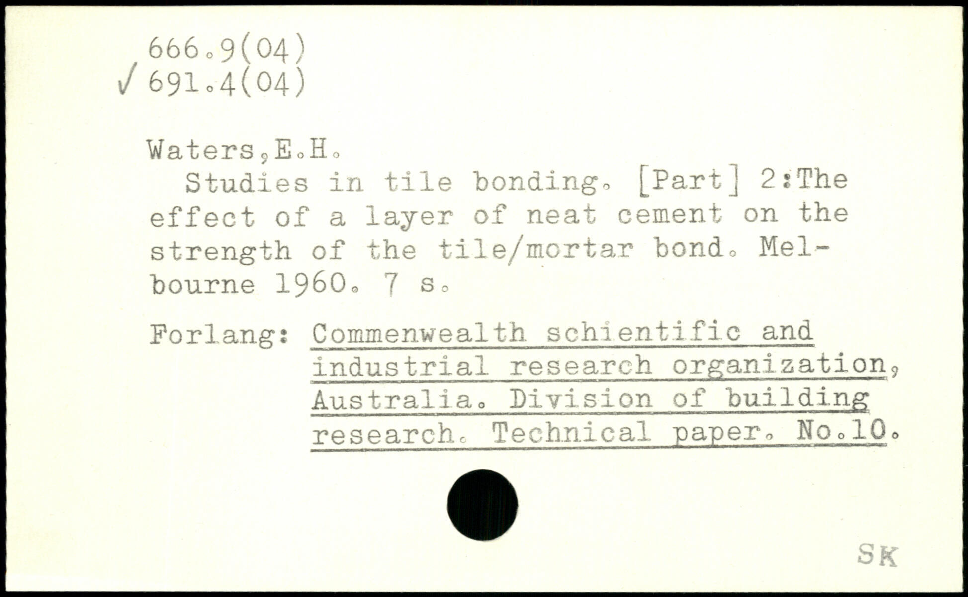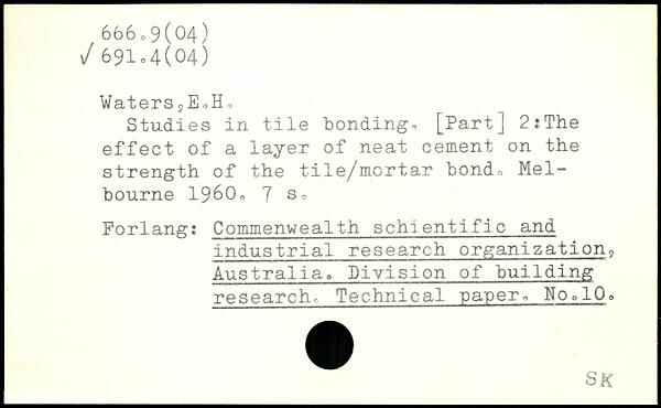 Waters 9EoHa Studies in tile bonding, [Part] 2?The effect of a layer of neat cement on the strength of the tile/mortar bond, Melbourne 1960